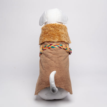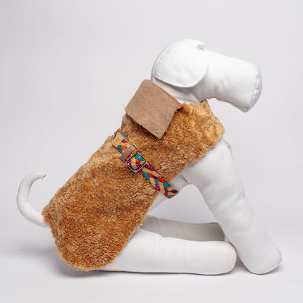 Double-sided dog coat, made to measure in soft eco-friendly champagne-colored tumbled sheepskin on one side and eco-friendly suede leather in the same shades on the other. This dog dress is completed with a precious belt in very soft multi-colored hand-woven goatskin for a lively and classic ensemble: never has it been easier to make your four-legged friend wear the garment. This dog jacket is washable in water.
