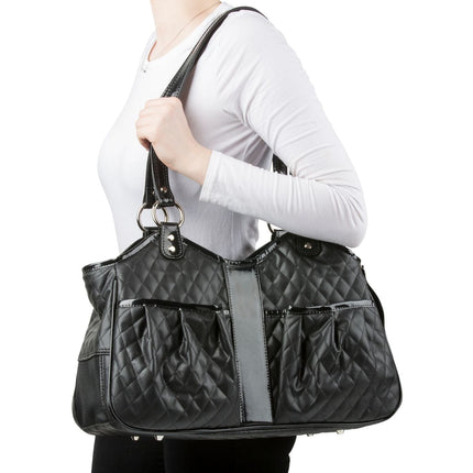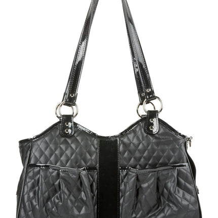 The Petote Quilted Luxe Metro Bag has all of the features you are looking for including: signature hardware, roll-up side windows, 3 mesh windows, inside adjustable safety hook, 2 deep outside pockets for storage, 1 zippered side pocket for additional storage, removable faux fur bedding, and waterproof nylon lining for easy cleaning. Large Metro 2 bag offers an option to carry two small dogs in one bag. The large size Metro 2 has two roll-up side windows--one on each end. The Metro Bag is airline approved for travel on most flights. Made in the USA.
