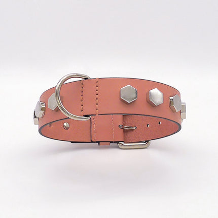 This design accessory for dogs, built in thick raw cut pink structural leather for absolute tear resistance, is edged in contrasting black and embellished with hexagonal gems studs in polished chromed metal. A refined and indestructible full polished chrome plated brass buckle and sturdy hand stitching complete the most glamorous accessory for your loving giant.
