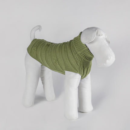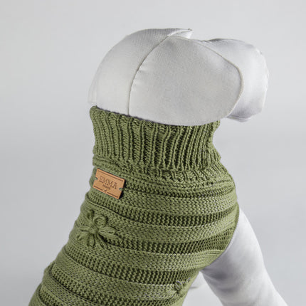 Pistachio color plain and purl stitch pure virgin Merino Superwash wool knitted dog coat with handmade floral embroideries . A warm and light garment to protect your four-legged friends on the cold days. Merino sheep fleece is highly valued and produces an extremely fine and precious wool, with a longer lifespan if we compare it with a standard wool obtained from a common sheep. The handy and comfortable fit of this sweater for dogs makes it perfect for your dog's protection.