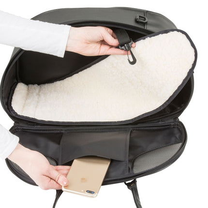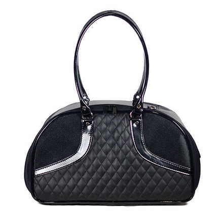 Black Quilted Roxy Bag is a best seller! The classic Roxy dog carrier gets a chic update featuring soft and chic black quilted vinyl along with shiny black patent trim. The Quilted Luxe Roxy has all the features you know and love including distinctive fashion handbag style and size, two sided mesh ventilation windows, roll-up side opening, dual zipper front entry, detachable fur lined pad inside carrier and headrest, adjustable leash hook for safety, nylon lining throughout inside carrier for easy cleaning and an inside pocket. This carrier is also equipped to be used as a kennel when traveling with your pet. It is a home away from home! Airline approved.