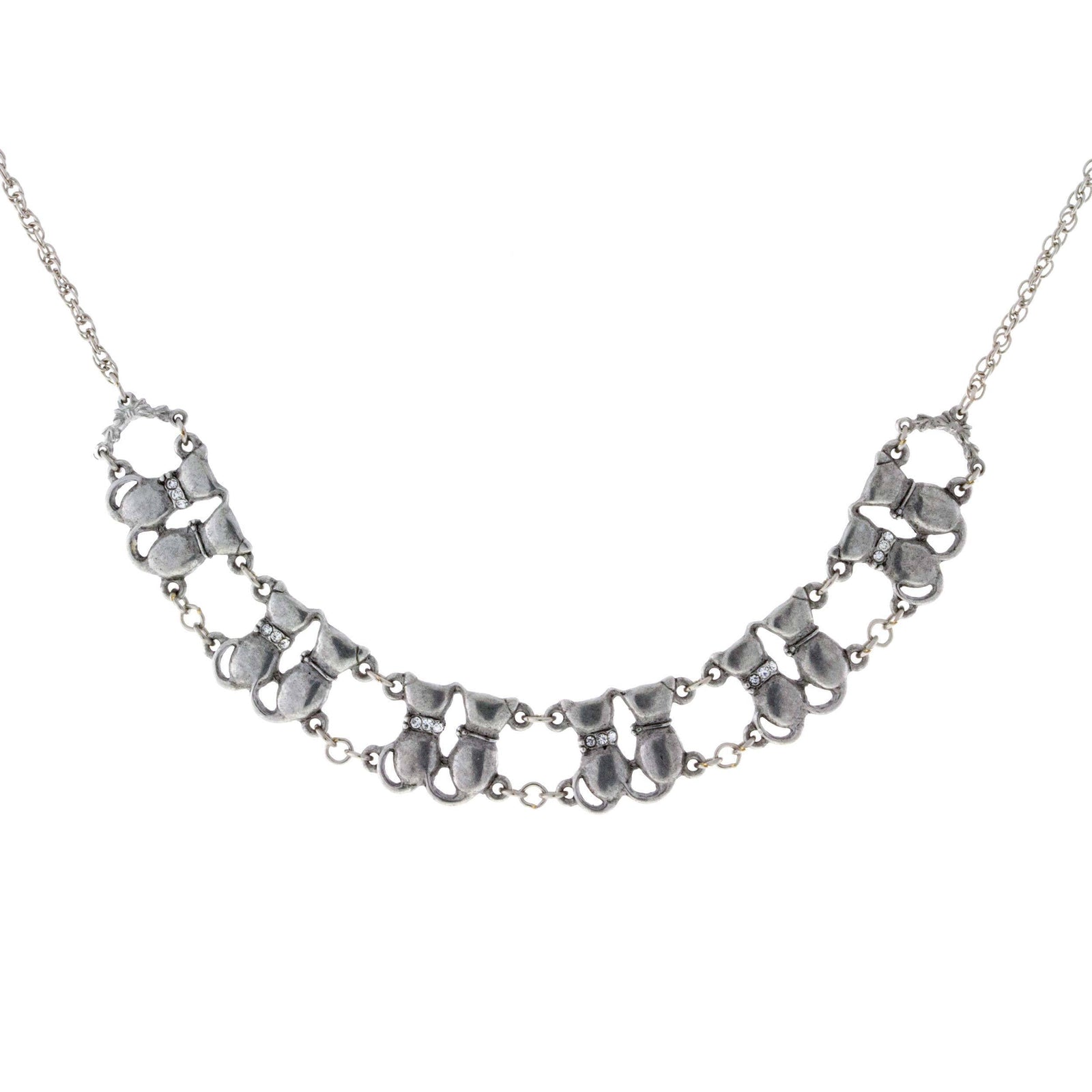Playful necklace crafted in silver tone metal that features sets of two kitty cats sitting side by side. Clear Czech crystal accents complete the look. The necklace secures with a lobster clasp.