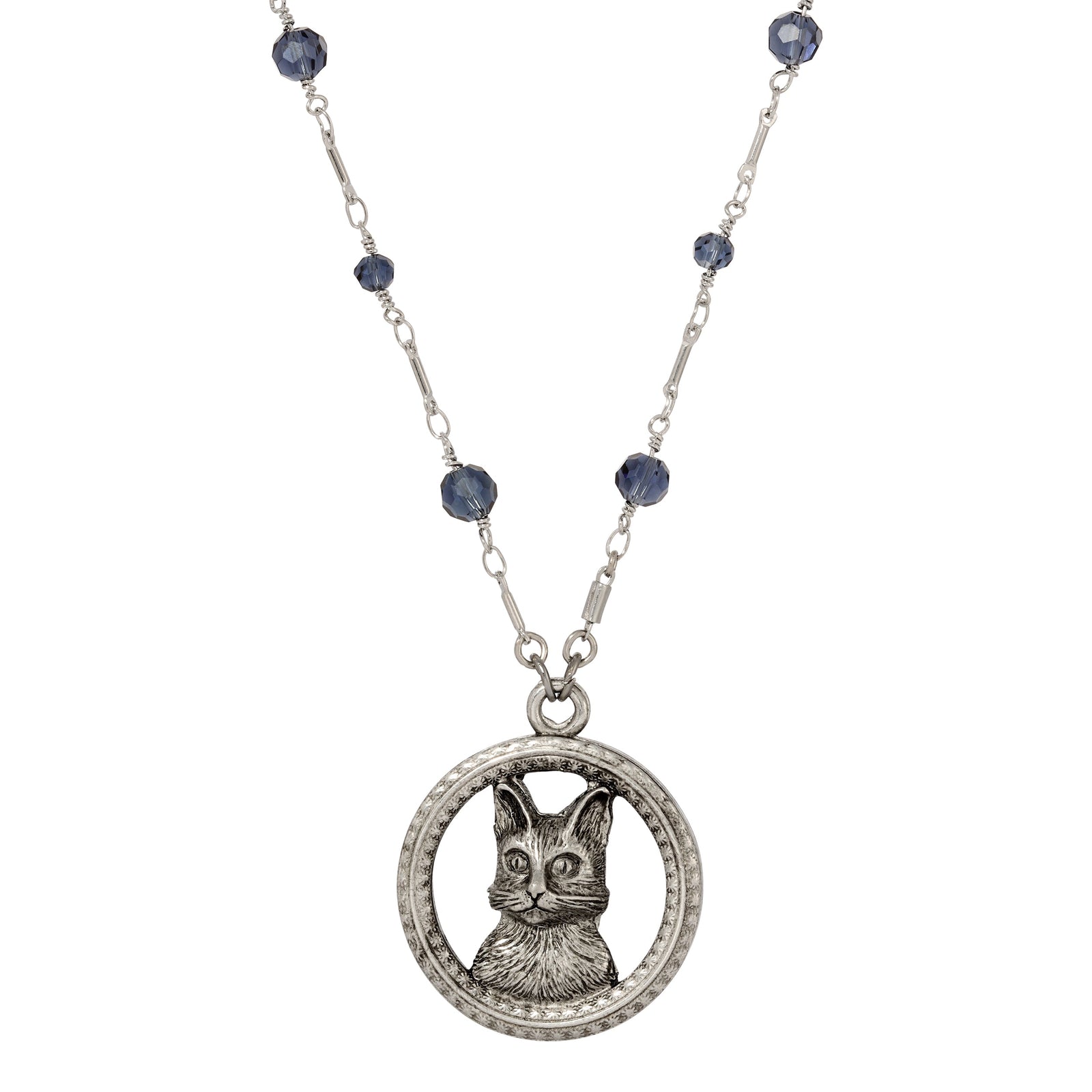 This meticulously designed circular frame showcases intricate, miniature floral motifs encircling a gracefully rendered cat at its core. The pendant dangles from an exquisite bar chain, adorned with dazzling Montana Blue round faceted glass crystals.