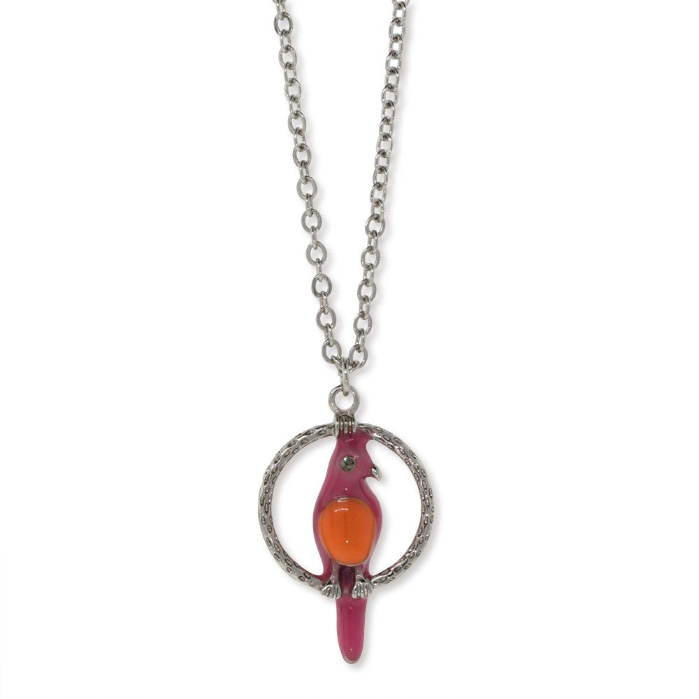 These irresistibly cute pewter necklace is hand enameled Parrot surrounded by a pewter branch hoops. The birds eyes are embedded with black glass stones for that subtle glimmer. A vintage must-have!