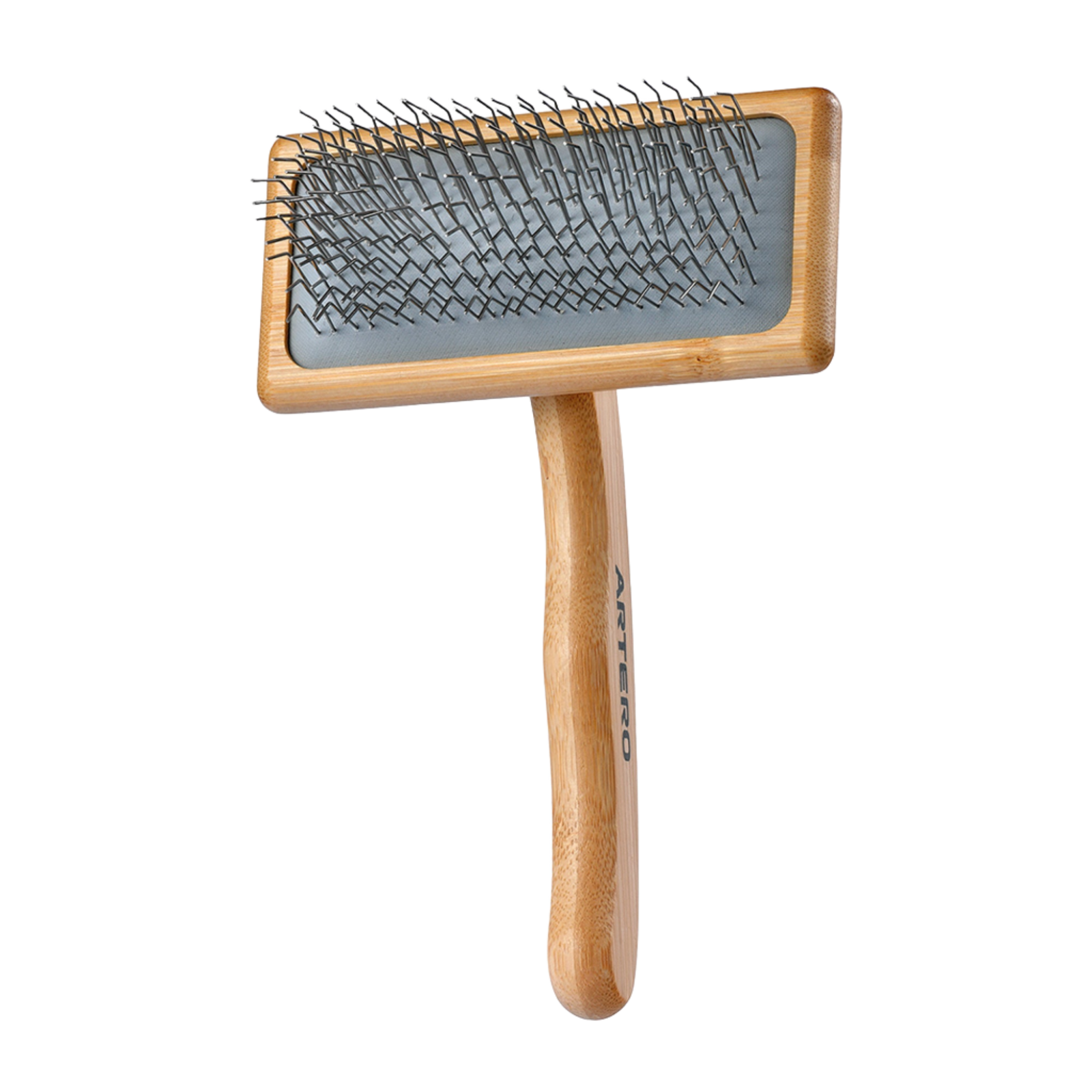 - Bamboo brush with air-cushion rubber system for a gentle and adaptable brushing experience Medium stiffness and gray color for optimal bristle adaptability to different surfaces Exclusive ergonomic handle design for a comfortable grip and effortless brushing Extra long and wide bristles to easily open tangles, knots, and remove shedding Arteros Nature Collection De-matting Slicker Brush is suitable for medium breeds with high hair density dogs Made of eco-friendly bamboo, comes in recyclable cardboard packaging How to Use: Hold the brush by the handle and present the side with the barbs on the coat, slide the barbs in the direction of the handle on tangles, knots repeatedly until they are eliminated