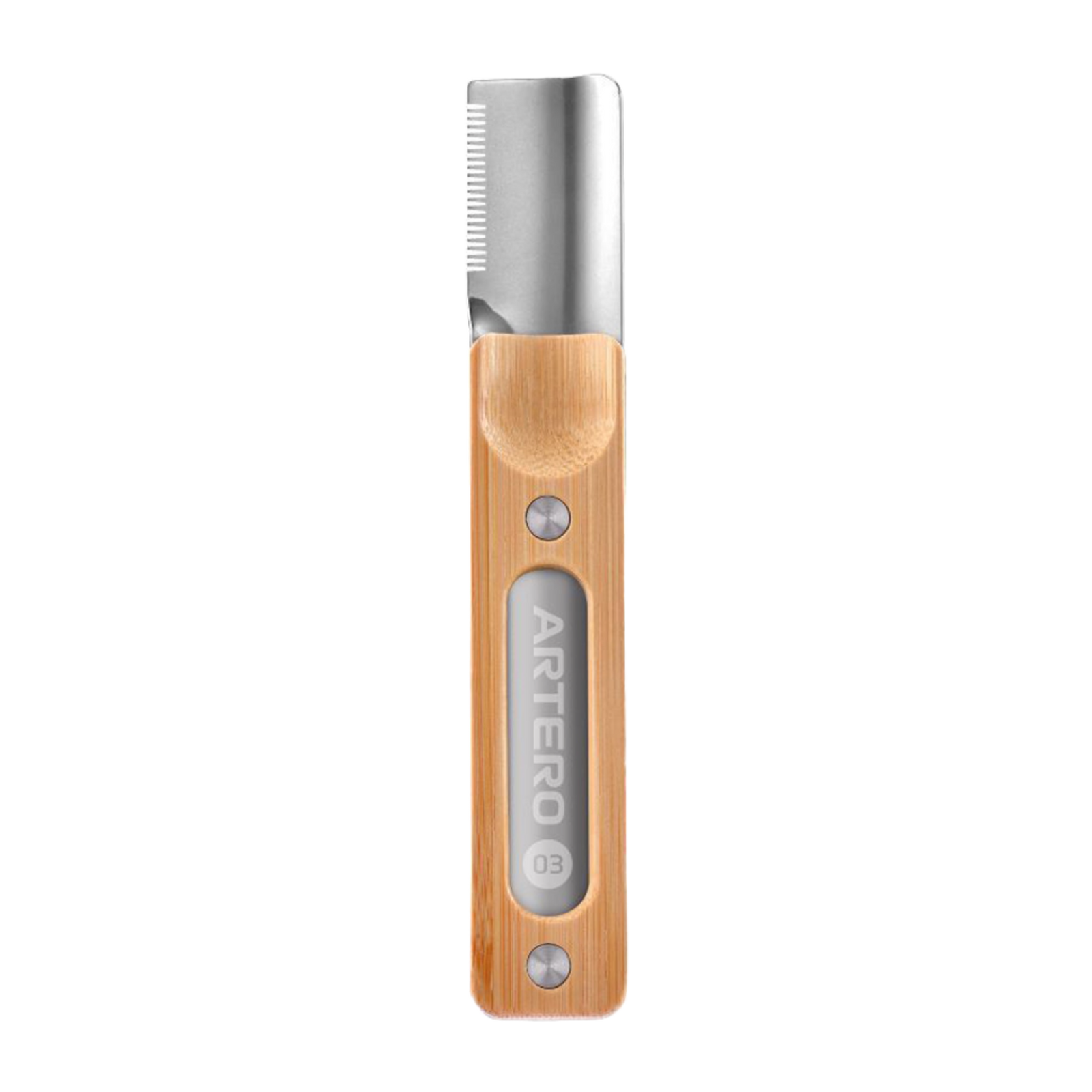 - Features a concave blade for ergonomic and efficient grooming Ideal for final stripping during commercial and showroom work Perfect for hand-stripping coats that require meticulous attention Ensure a straight wrist and follow the natural body contour for optimal results Made with high-quality stainless steel blade that combines strength and lightweight handling Durable bamboo handle to provides a comfortable grip during dog grooming Features fine teeth to effortlessly remove intermediate hairs and create a polished appearance Suitable for use on dogs with hard coat types Easy-to-follow instructions: Grip hair between thumb and blade, pull in the direction of hair growth to see all Brushes to see all Artero products Find more at www.HTAnimalSupply.com.