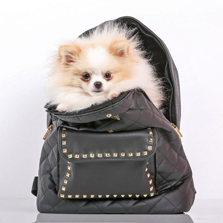 This luxurious Prince and Princess dog backpack is perfect for travel or for a walk around town. Extremely elegant and made of quilted black faux leather, it comes equipped with a safety hook, taupe lining and a cushion made of soft faux fur on the inside. The pocket on the front for personal items is enriched with golden studs and adjustable suspenders.