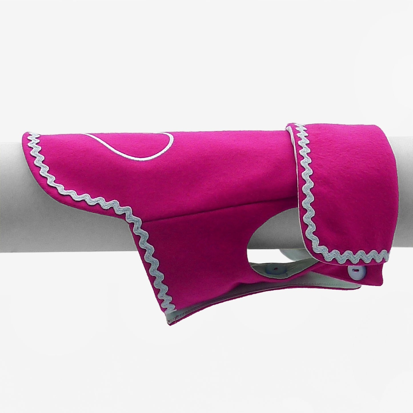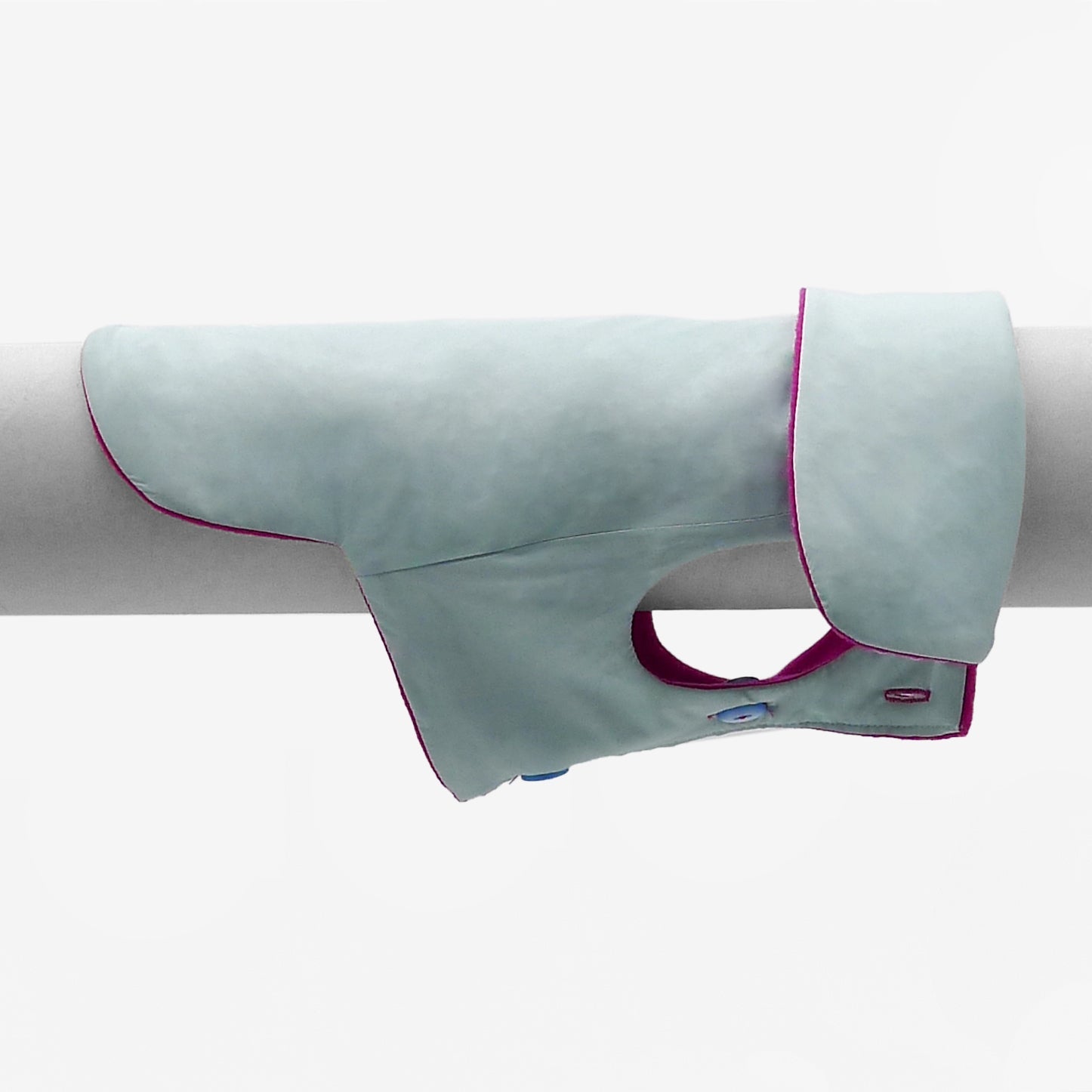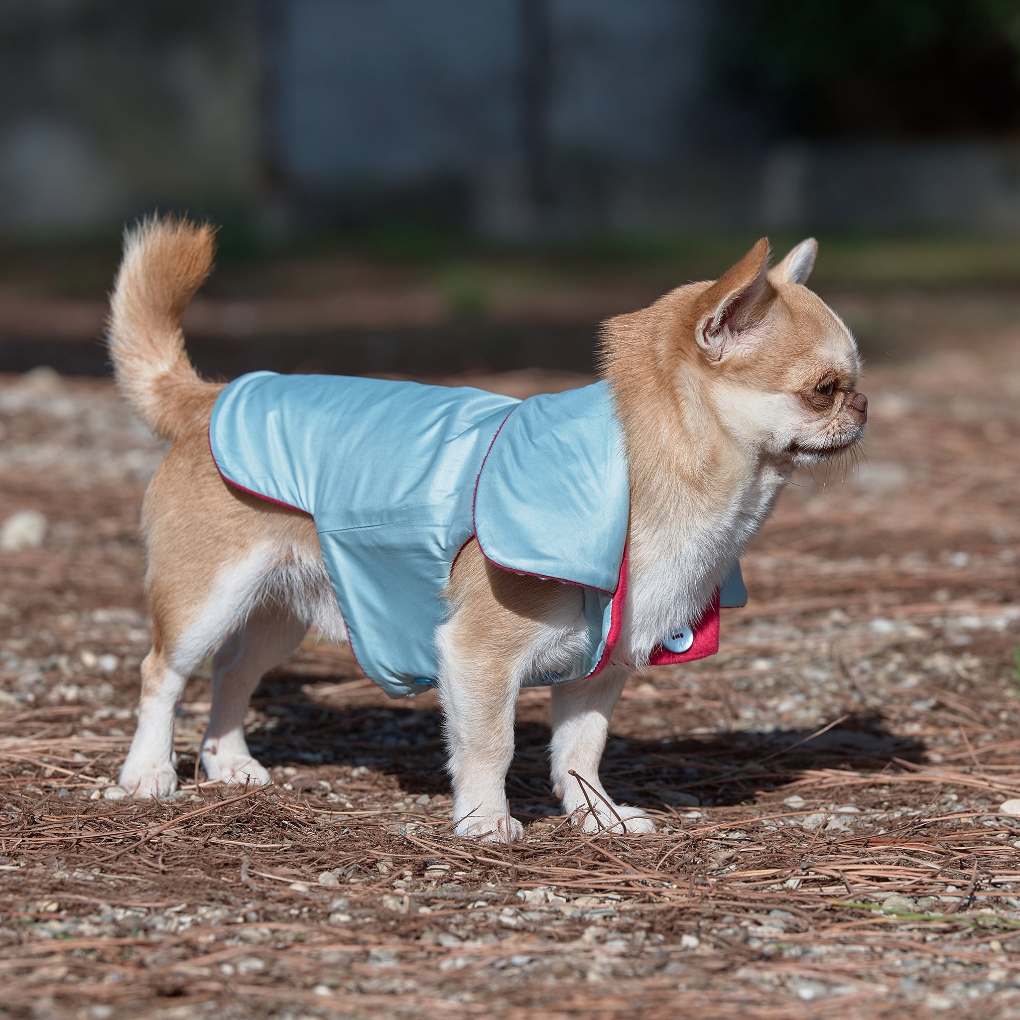 Dog coat that is part of the 'Cuore' collection, double-sided, made to measure in soft and warm begonia color cashmere blend fabric on one side and sky blue waterproof fabric on the other: a garment for dogs that combines the soft caress of cashmere and the resistance of pure wool to the practicality of the highest performing waterproof trench coat.