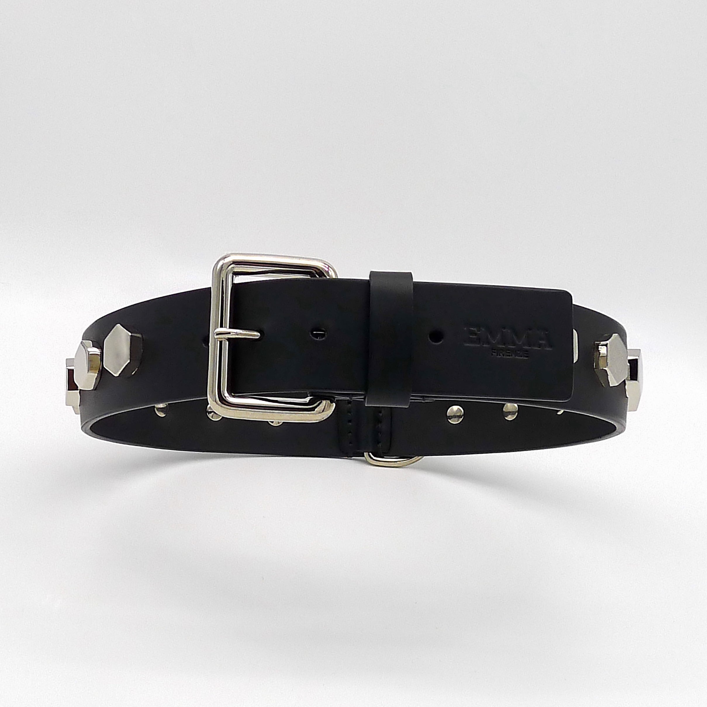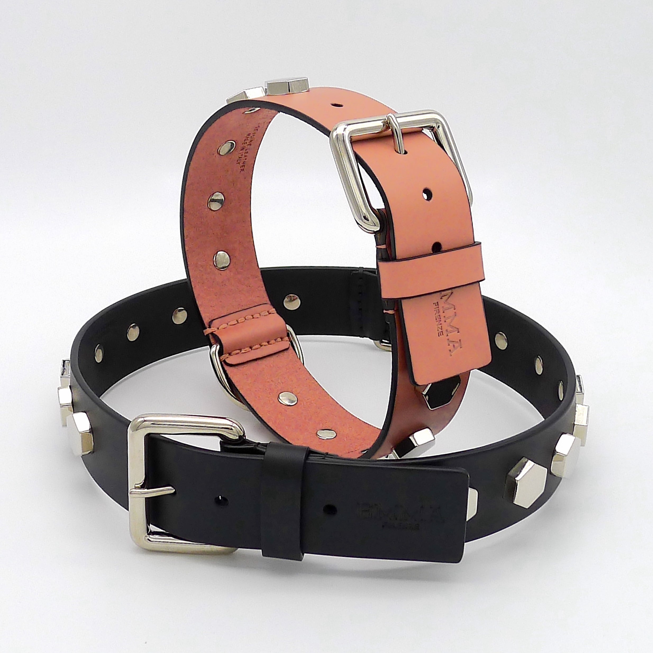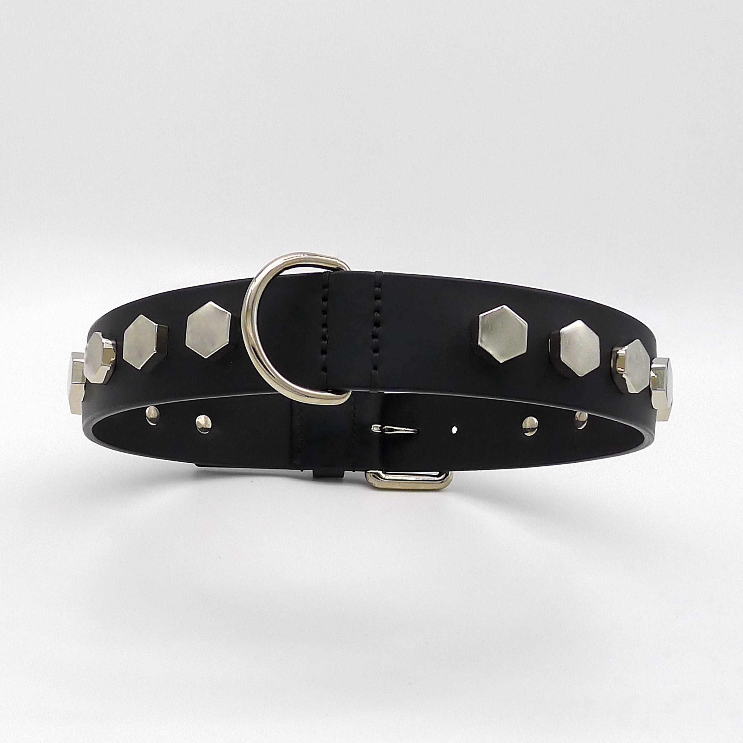 This luxury accessory for dogs, built in thick raw cut black structural leather for absolute tear resistance, is edged in black and embellished with hexagonal gems studs in polished chromed metal. A refined and indestructible full brass polished chrome buckle and sturdy handmade stitching complete the most fashionable accessory for your loving giant.