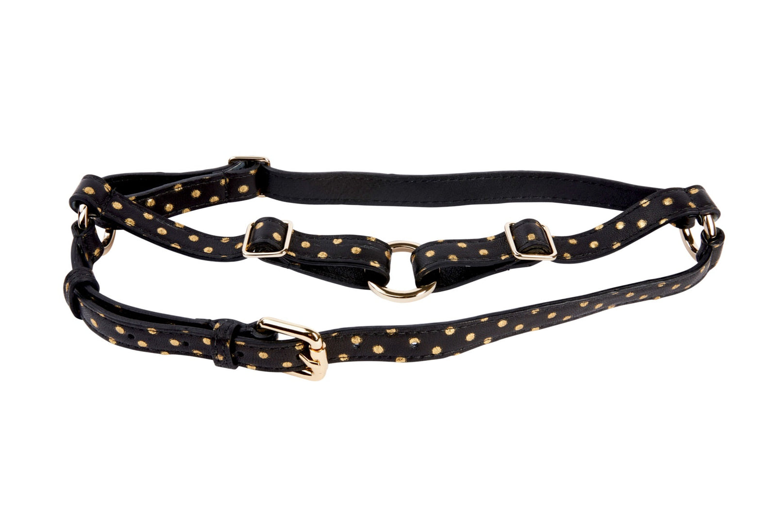 Introducing the Black & Gold Polka Dot Italian Leather Harness – a statement of sophisticated fashion and luxury. Crafted with premium materials and designed to turn heads, this piece adds a touch of glamour to any wardrobe. Ideal for those who demand both style and exclusivity in every detail.
