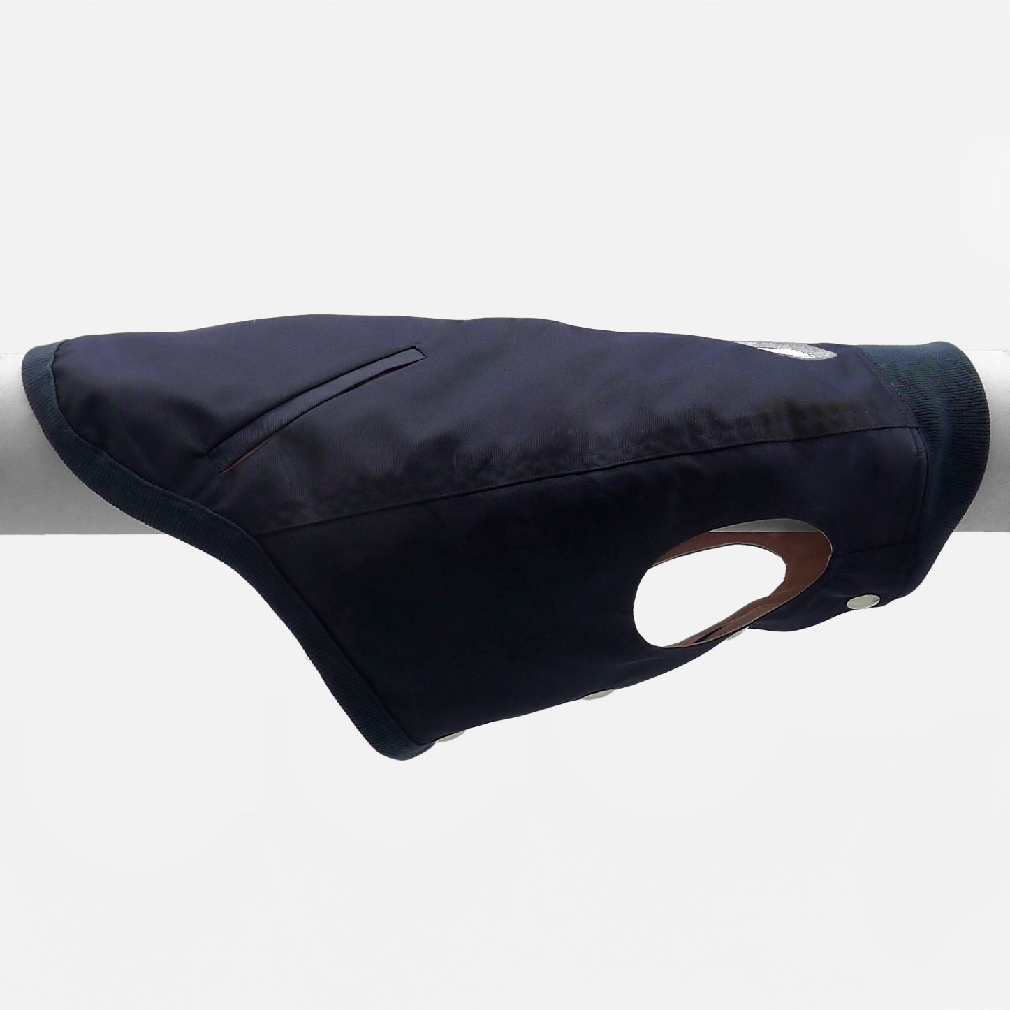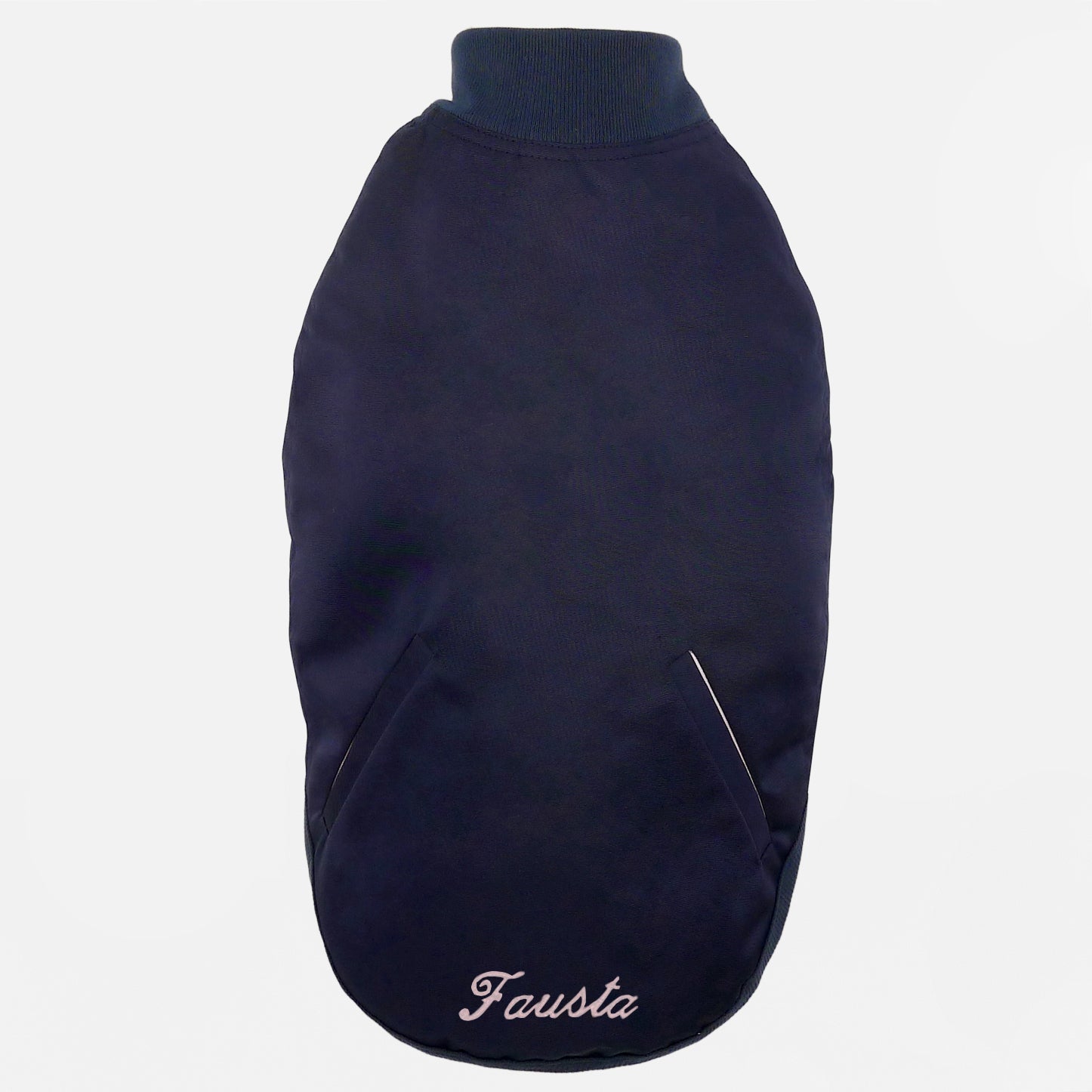 Waterproof jacket for dogs, made to measure in navy blue on the model of the historic bomber jacket, with pale pink cotton lining; a combination of the trendy colors with the of the Milanese and Parisian official fashion catwalks and a design that respects the original version, from the stitching to the comfortable welt pockets and the typical metal buttons; a garment originally created for British pilots of the Royal Flying Corps who flew open aircraft during the Great War and needed heavy garments to resist cold temperatures and wind. Made a comeback in the 70s as a jacket for American college students and baseball players it will experience a second renaissance during the 80s, becoming an essential jacket in the wardrobe of the younger generations. An item of clothing that is back in vogue that could not be missing from the EMMA Firenze collections!