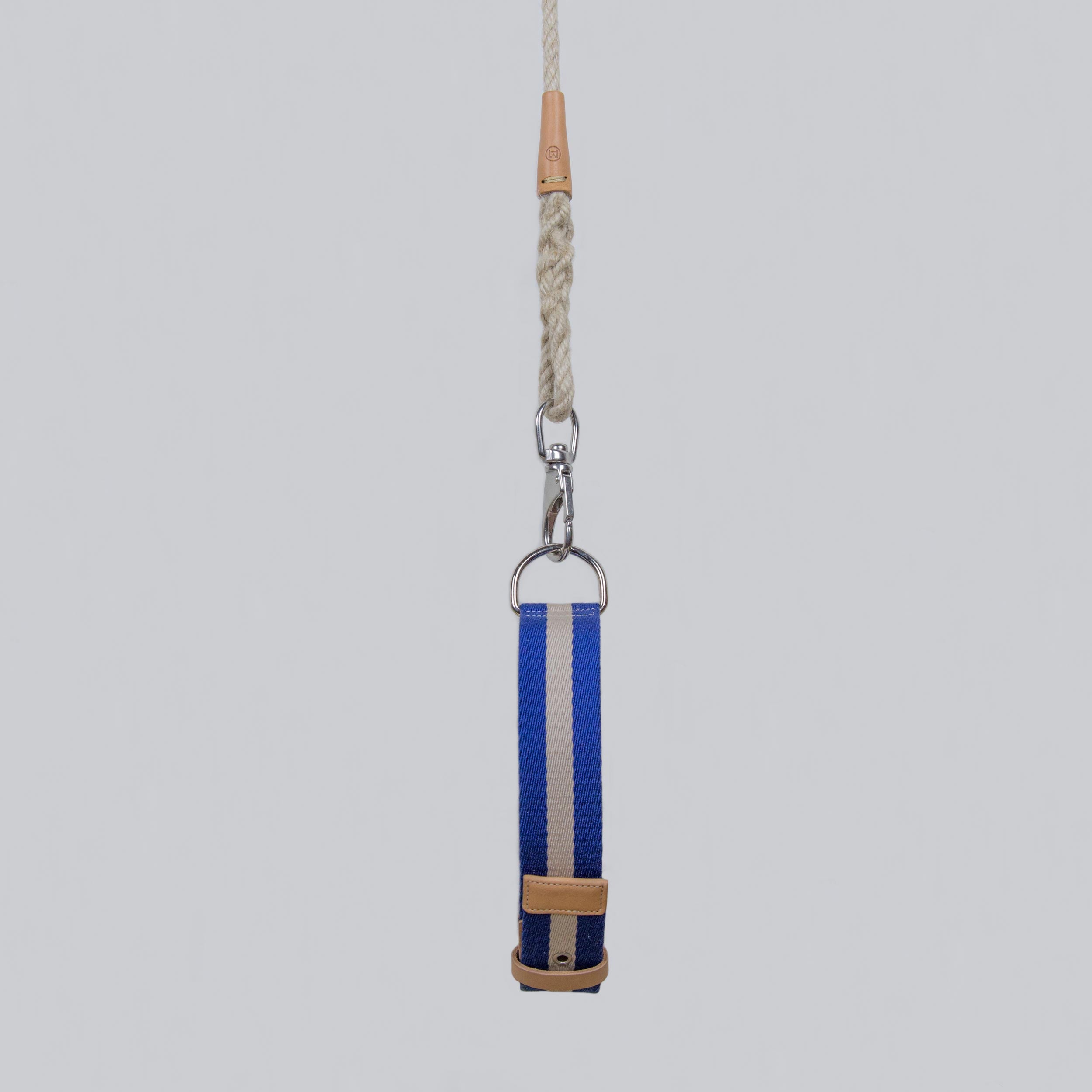 Blue and Cream striped fabric collar, with sharp-cut cowhide details and metal accessories. The colorful 'TAPE' collection is offered in one size per version and made out of a particularly strong fabric tape, wear and tear and traction resistant. Matchable to our 'NAVY JUTE' leashes collection. A collar with a handy, strong, original and unmistakable style!