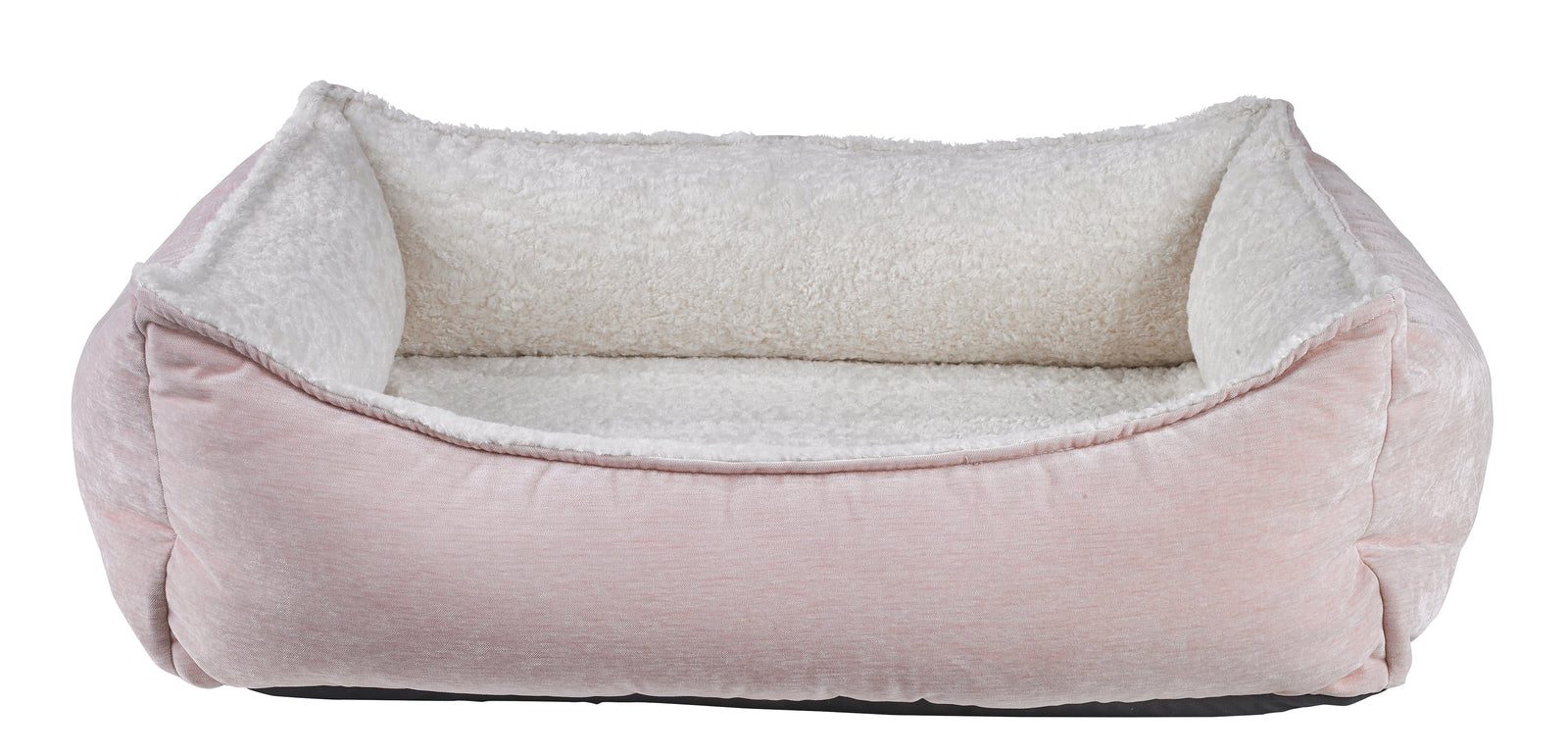 Easy entry scooped front design combined with cool gel memory foam support. The memory foam cushion insert is infused with Cool Gel Micro Beads which helps regulate body temperature. Elegant two-tone fabric combination and European style "pinched edge” trim. Generous sizing maximizes sleeping area.