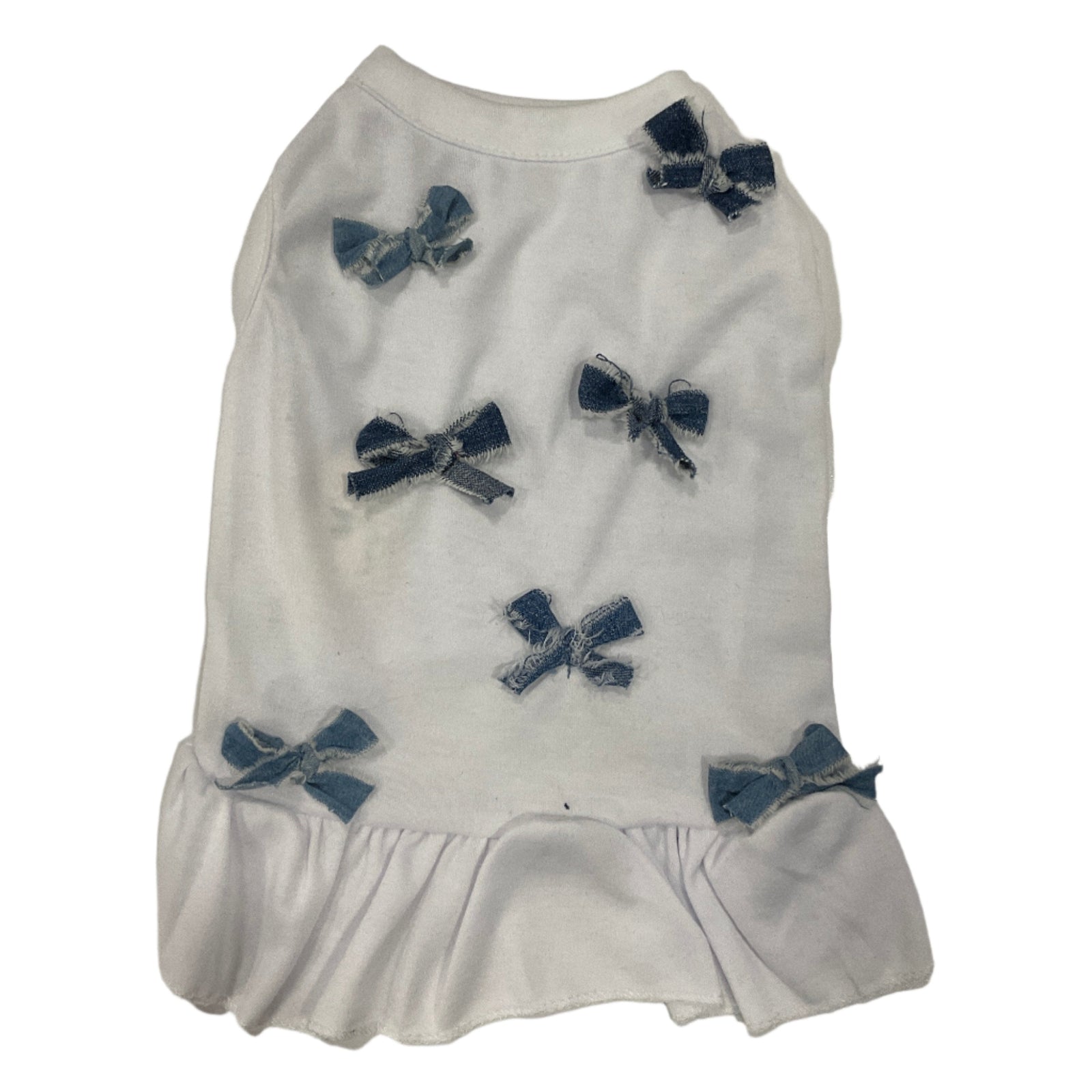 Looking for a playful twist on a classic? Look no further than our Bow Dress Shirt! This white cotton dress features little denim bows along the collar and a gathered skirt, adding a touch of whimsy to your wardrobe. Perfect for brunch or a casual day out. (Bow down to this dress!)