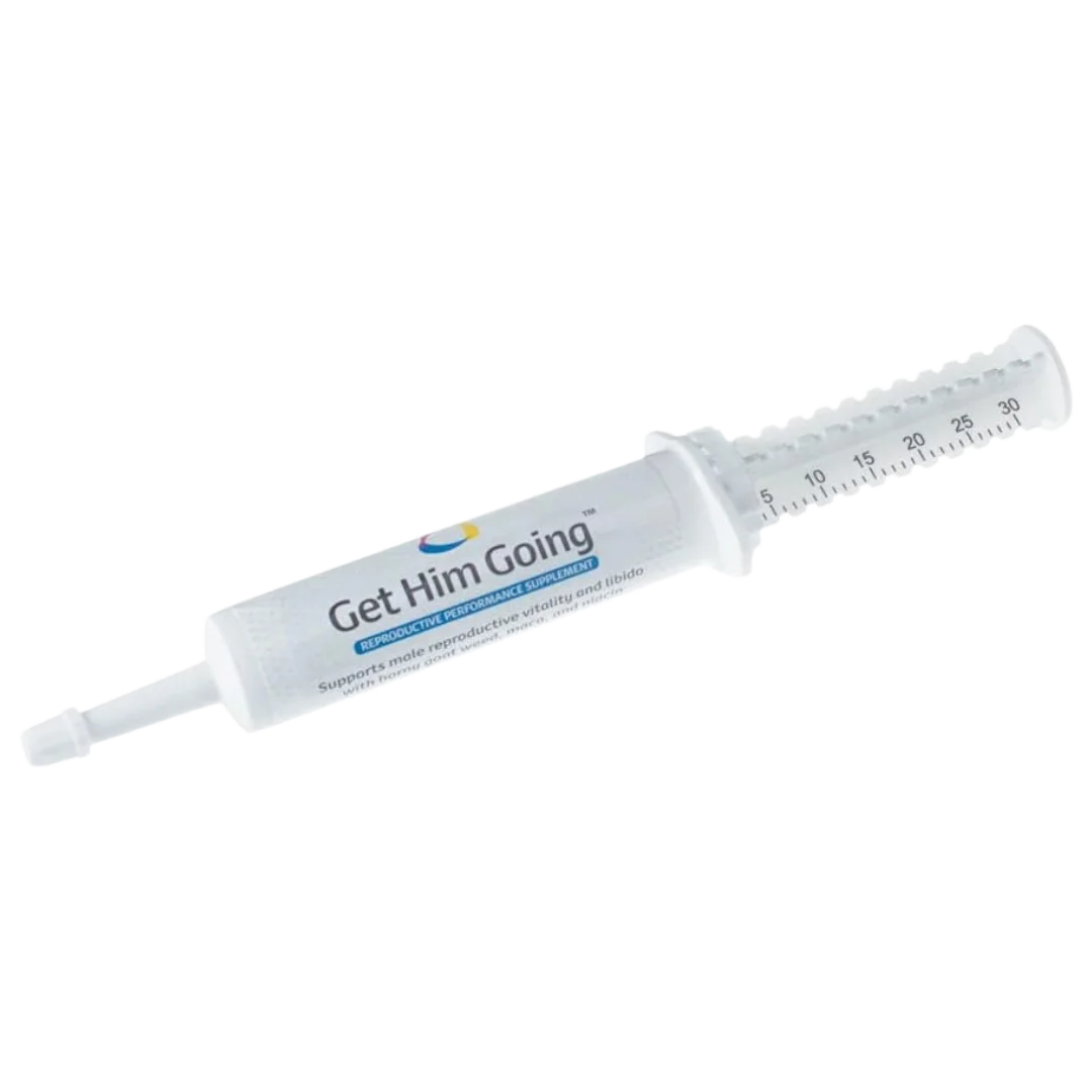 Breeder's Edge Get Him Going 30ml supports male reproductive performance in dogs and cats. Horny Goat Weed supports healthy libido and sexual function Maca Root boosts vitality and energy levels Ashwagandha enhances energy and overall reproductive health Niacin supports circulation and energy metabolism Sarsaparilla Root reduces inflammation and supports hormone regulation Supports male reproductive performance in dogs and cats Natural herbal formula with vitamins for optimal results Made in the USA Directions for Use For best results, administer 3-5 days before breeding or collecting. Dogs under 20 lbs Cats Give 2 ml once daily Dogs 20-50 lbs Give 3 ml once daily Dogs over 50 lbs Give 4 ml once daily Give orally once daily to male dogs and cats Click HERE to see all Health and Wellness products Click HERE to see all Breeder's Edge products. Discover premium quality trusted by pet parents seeking comfort, durability, and top trending pet care essentials. Shop now at www.HTAnimalSupply.com for fast shipping.