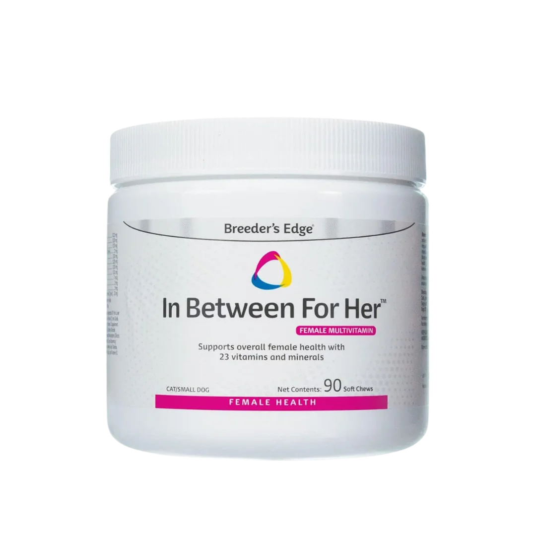 Breeder's Edge In Between For Her 90ct Cat Small Dog fills the nutritional gaps that may exist in the diet of female cats and dogs. Daily multivitamin designed for breeding female dogs and cats Supports reproductive, bone, skin and coat health Vitamin B to maintain a healthy reproductive system, calcium for bone health, biotin for healthy skin and coat, and iron as a blood builder 23 key vitamins and minerals Made in the USA Flavor Pork liver, Color Brown Count 90 soft chews Directions for Use Give daily between breedings. Dogs under 20lb and cats, 1 small soft chew per day. Dogs over 20lb, 2 small soft chews per day. Dogs 20-60lb, 1 medium large soft chew per day. Dogs over 60lb, 2 medium large soft chews per day. Click HERE to see all Health and Wellness products Click HERE to see all Breeder's Edge products. Discover premium quality trusted by pet parents seeking comfort, durability, and top trending pet care essentials. Shop now at www.HTAnimalSupply.com for fast shipping.