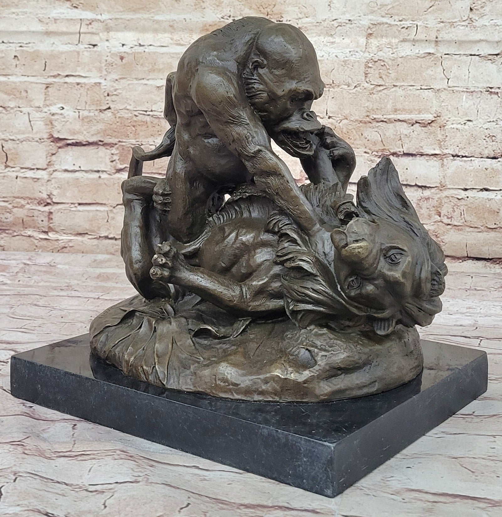 The rich dark brown patina finish enhances the details of the gorilla and lion, showcasing their muscular forms and fierce expressions. Each element of the sculpture, from the intricate textures of their fur to the dynamic poses, is meticulously sculpted, reflecting the artist's expertise and attention to detail.