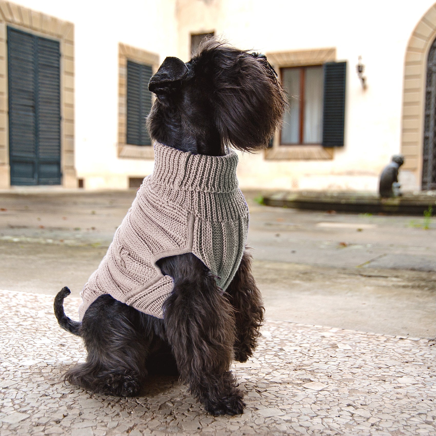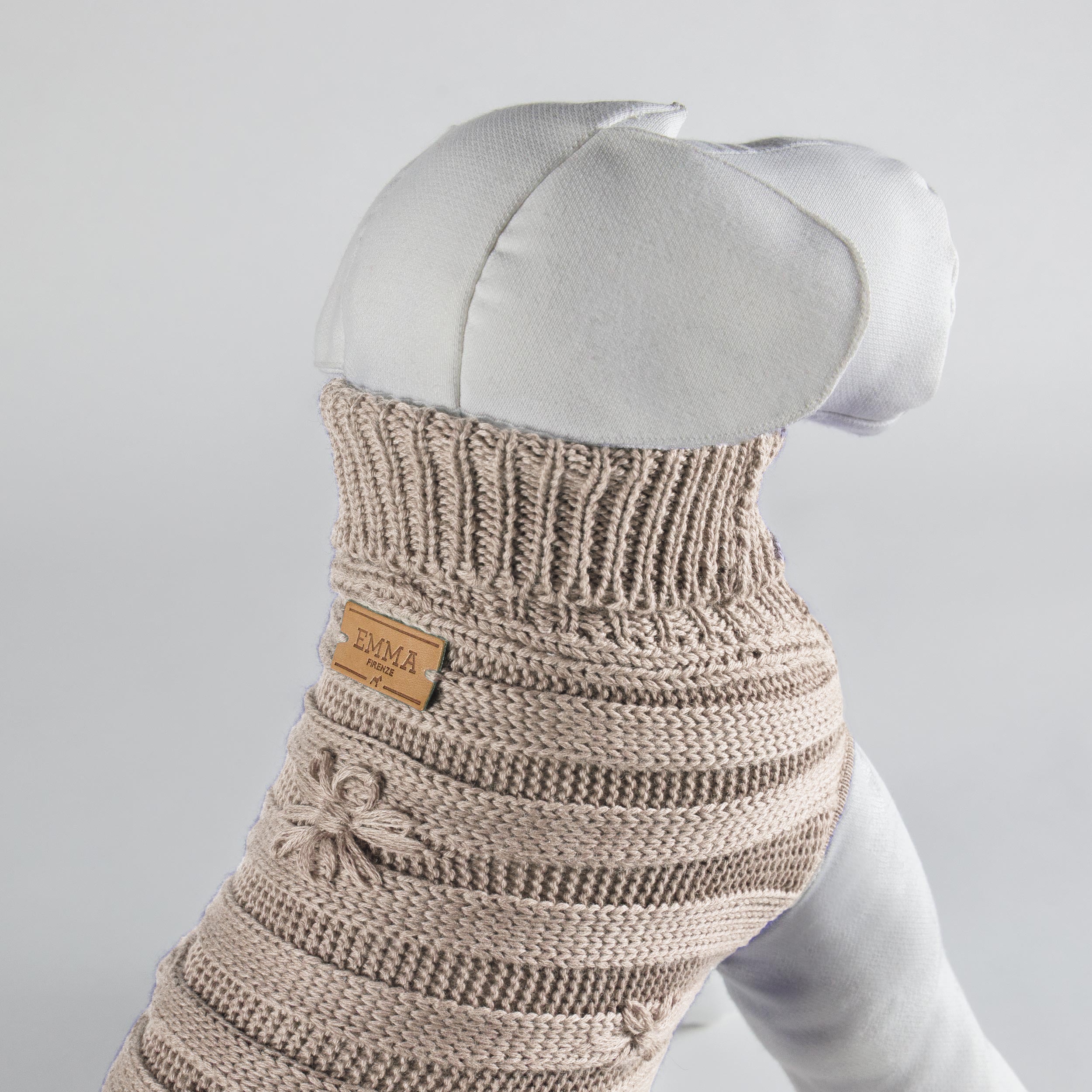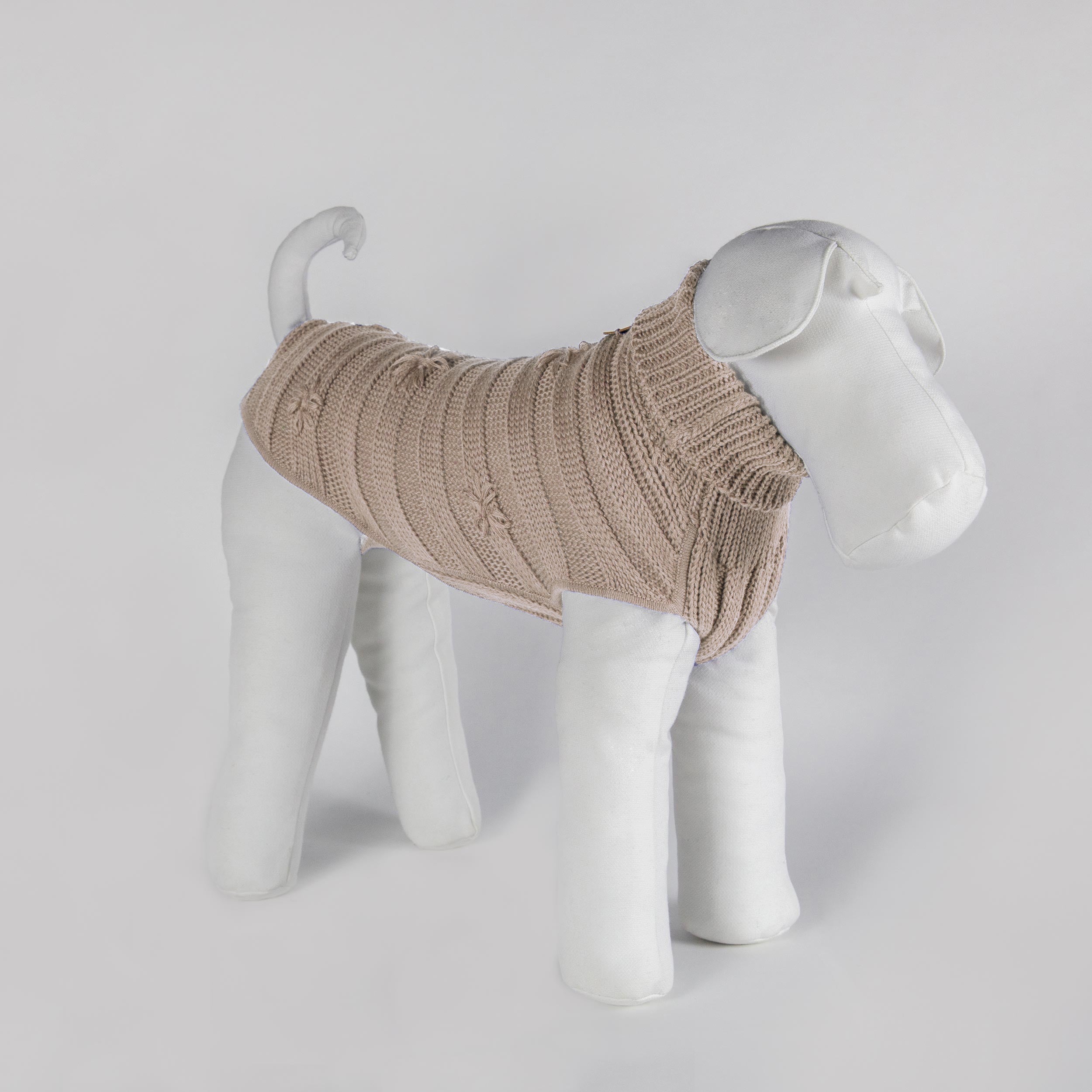 Butter-color plain and purl stitch pure virgin Merino Superwash wool knitted dog coat with handmade floral embroideries. A warm and light garment to protect your four-legged friends on the cold days. Merino sheep fleece is highly valued and produces an extremely fine and precious wool, with a longer lifespan if we compare it with a standard wool obtained from a common sheep. The handy and comfortable fit of this sweater for dogs makes it perfect for your dog\u2019s protection. An ideal sweater for Dachshunds, Chihuahuas, Greyhounds, Pinscher and all small four-legged friends and more.