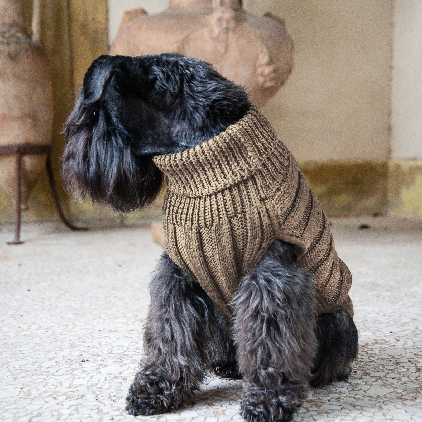 Camel-color plain and purl stitch pure virgin Merino Superwash wool knitted dog coat, a must among the timeless classics. A warm and light garment to protect your four-legged friends in the cold days. Merino sheep fleece is highly valued and produces an extremely fine and precious wool, with a longer lifespan if we compare it with a standard wool obtained from a common sheep. The handy and comfortable fit of this sweater for dogs makes it perfect for your dog\u2019s protection. An ideal sweater for Dachshunds, Chihuahuas, Greyhounds, Pinscher and all small four-legged friends and more.