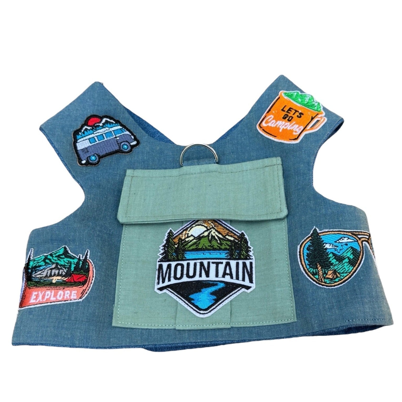 Get ready for fun in the sun with our Camp Harness in River! This two-tone, hand-dyed organic cotton harness offers both comfort and functionality for your pup. With a cargo pocket for treats and adorable camping-themed patches, this harness is perfect for any adventure. Lined with durable denim and fastened securely with hook and loop closures. Personalize it with your pup's name for a unique touch! Available in sport mode for active dogs. Handmade to order, pair with our Camp Bucket Hat & Poop Bag Carrier in River.