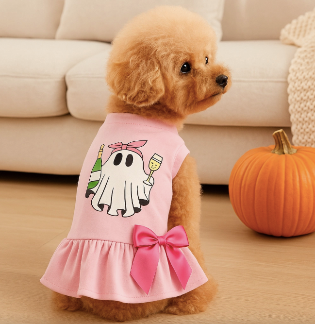 A party girl‚ ghost‚complete with bubbly! Our Champagne Boo Bash Dress pairs blush-pink softness with a flounced hem and an illustrated chic little ghost raising a bottle and flute in spirited celebration. A satin bow at the hip adds playful polish worthy of any fall from Howl-o-ween gatherings to girls‚Äô night paw-tinis.