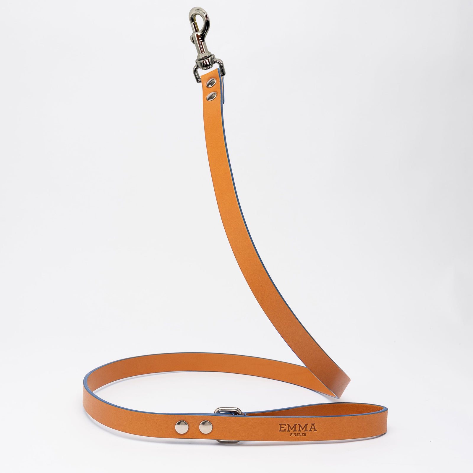 This new luxury leash is made of coupled camel-colored leather with raw cut edges and hand-made cobalt blue profiles and bindings and enriched with a shiny nickel-plated carabiner. A handy rectangular metal ring stopped with coral-colored handmade seams, placed under the handle, allows the bag holders to be hooked. Resistant nickel-plated rivets guarantee maximum resistance and tear resistance.