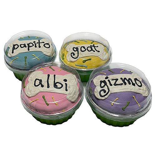 Our best selling shelf stable Big E's cupcakes, and they can be personalized! That's right, no refrigeration or freezing necessary, these cupcakes are shelf stable for 1 year like the rest of our treat line. They are densely chewy in texture (like a biscotti/day old brownie combo). They are a peanut butter apple cake and can be cut for smaller dogs. Great for one medium-large dog. Since these are not birthday specific, they make a great option year round. They are best cut with a serrated knife.