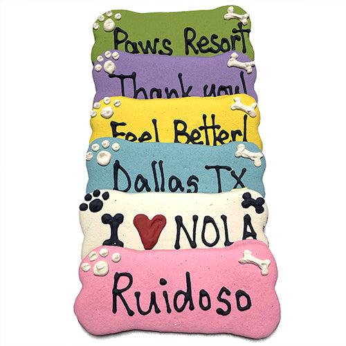 That's right, custom bones! We can write whatever you want, as long as it fits, so let your heart run wild and pick something fun, festive, sweet, or your city, store name, town? It's your call. Made with our crowd favorite peanut butter recipe, dogs will love.