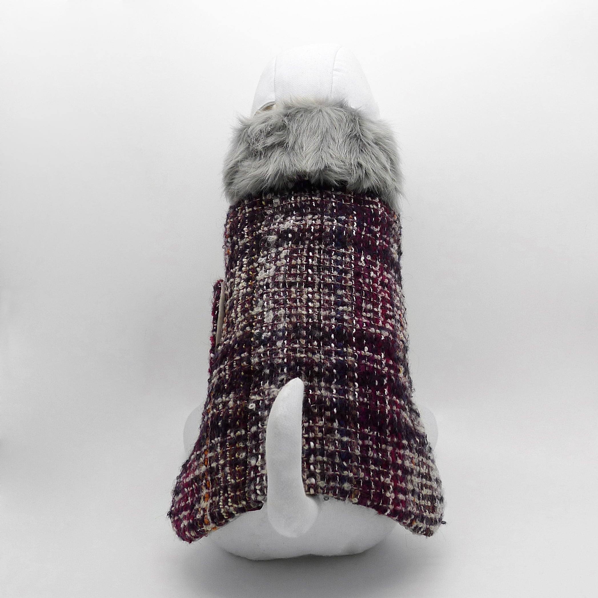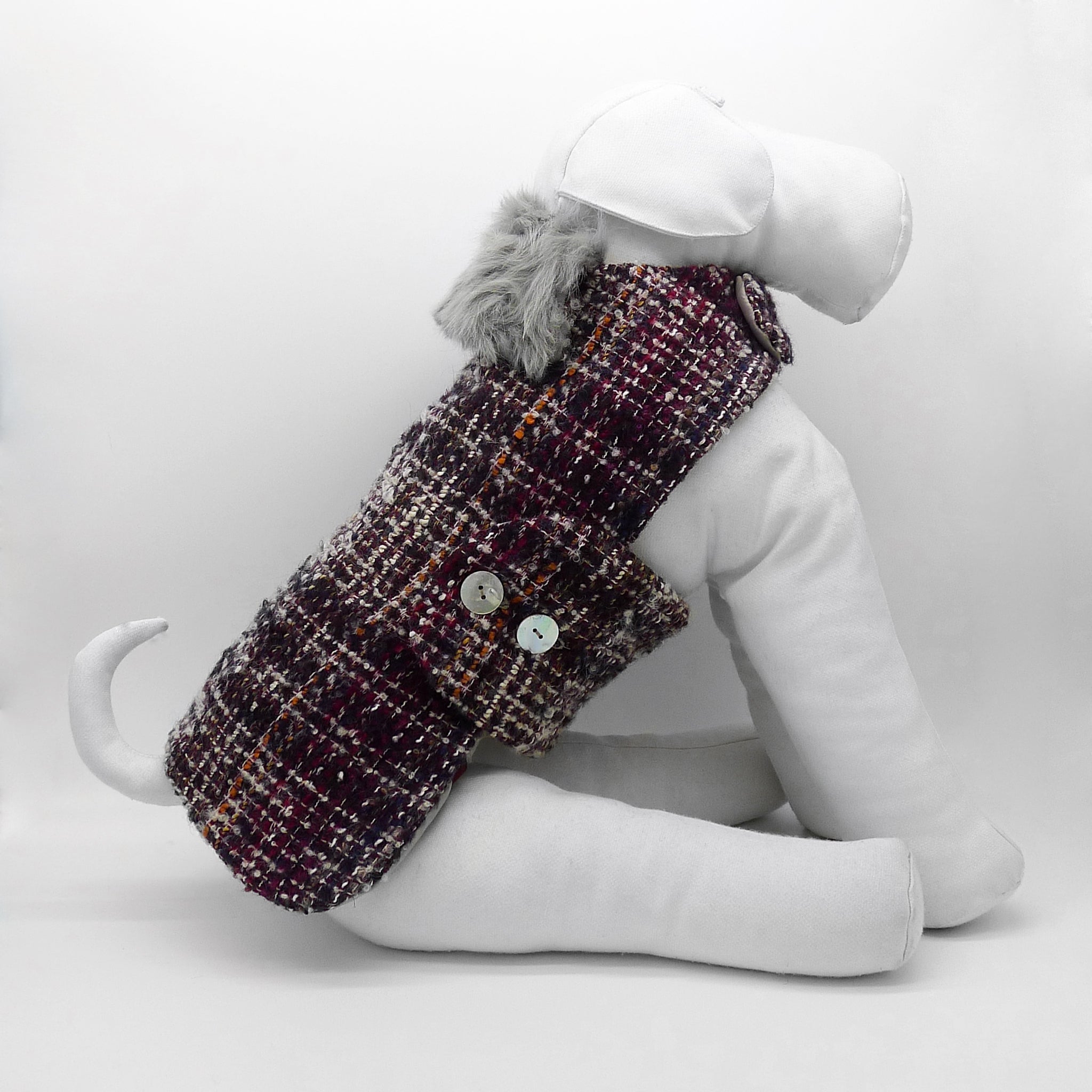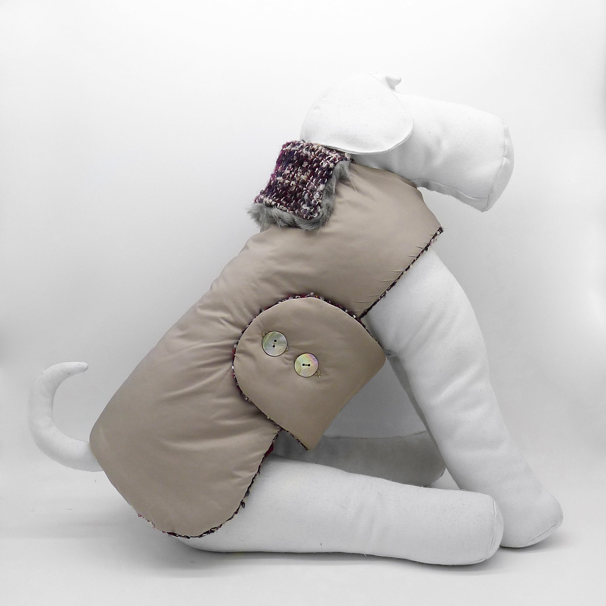 Double-face coat down jacket for dogs in Chanel fabric in shades of wine red and pearl gray with a waterproof pearl gray side. Belly band with closure buttons in real natural mother-of-pearl and pearl gray faux fur collar.