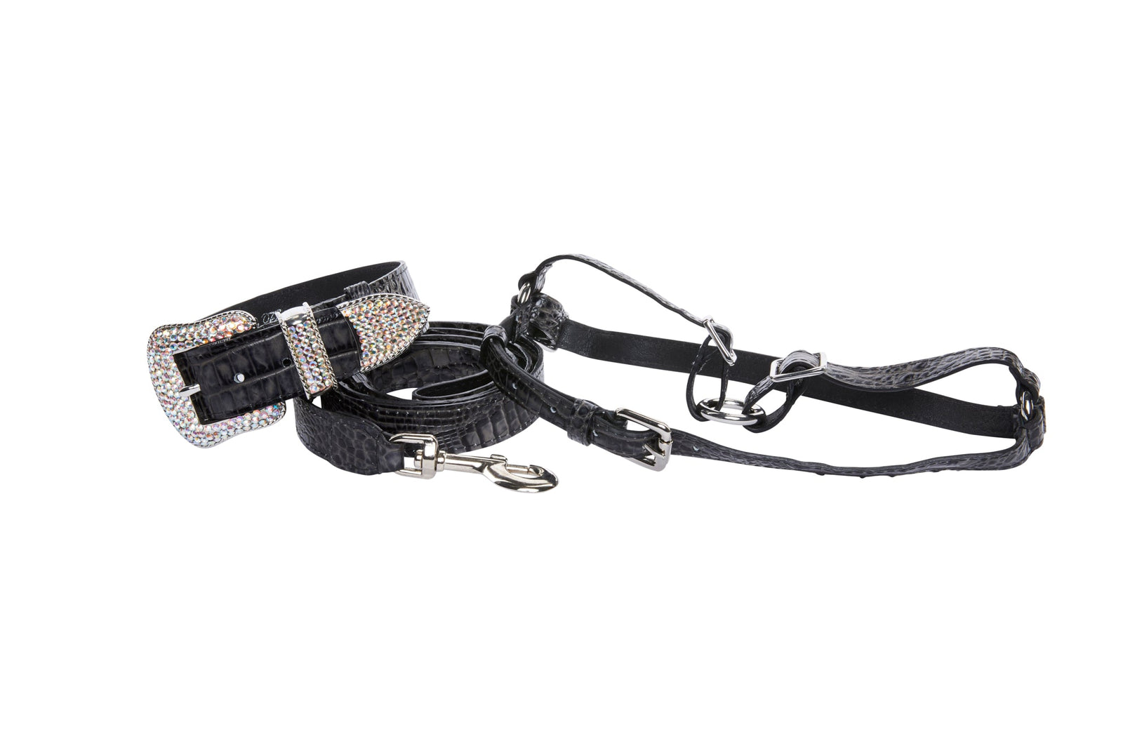 Introducing the Dark Grey/Light Grey Embossed Croc Italian Leather Silver Swarovski Crystal Collar, Leash, Harness Set – a statement of sophisticated fashion and luxury. Crafted with premium materials and designed to turn heads, this piece adds a touch of glamour to any wardrobe. Ideal for those who demand both style and exclusivity in every detail.