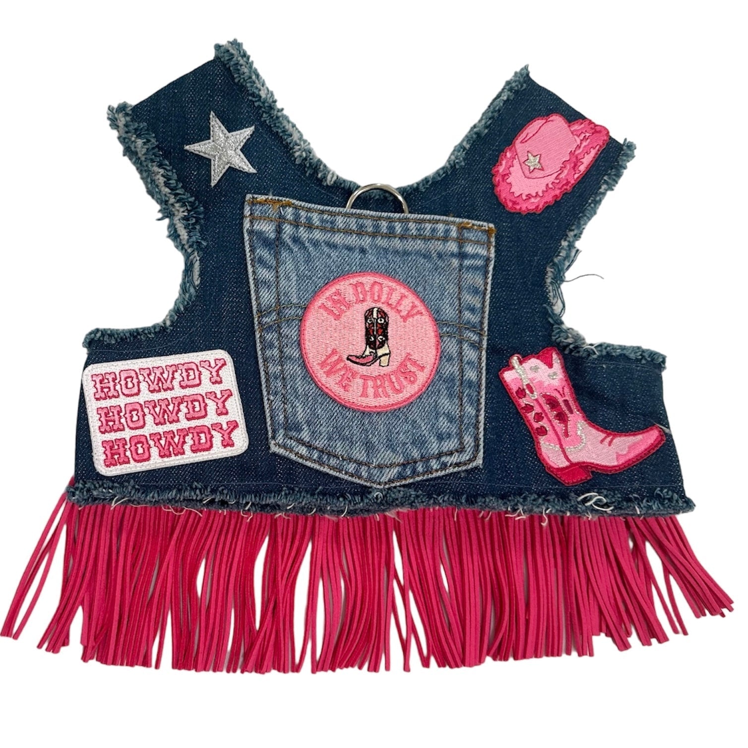 By popular demand here's our ode to Dolly!!! With a recycled denim pocket, a secure D-ring for leash walking and hook and loop fasteners. Decorated with the best country girl vibes, this harness features a "IN DOLLY WE TRUST" patch, supported by other coordinating patches. Optionally, you can order this harness with or without the hot pink faux suede fringe. Shades of denim may vary. Please check the size chart in the last photo.