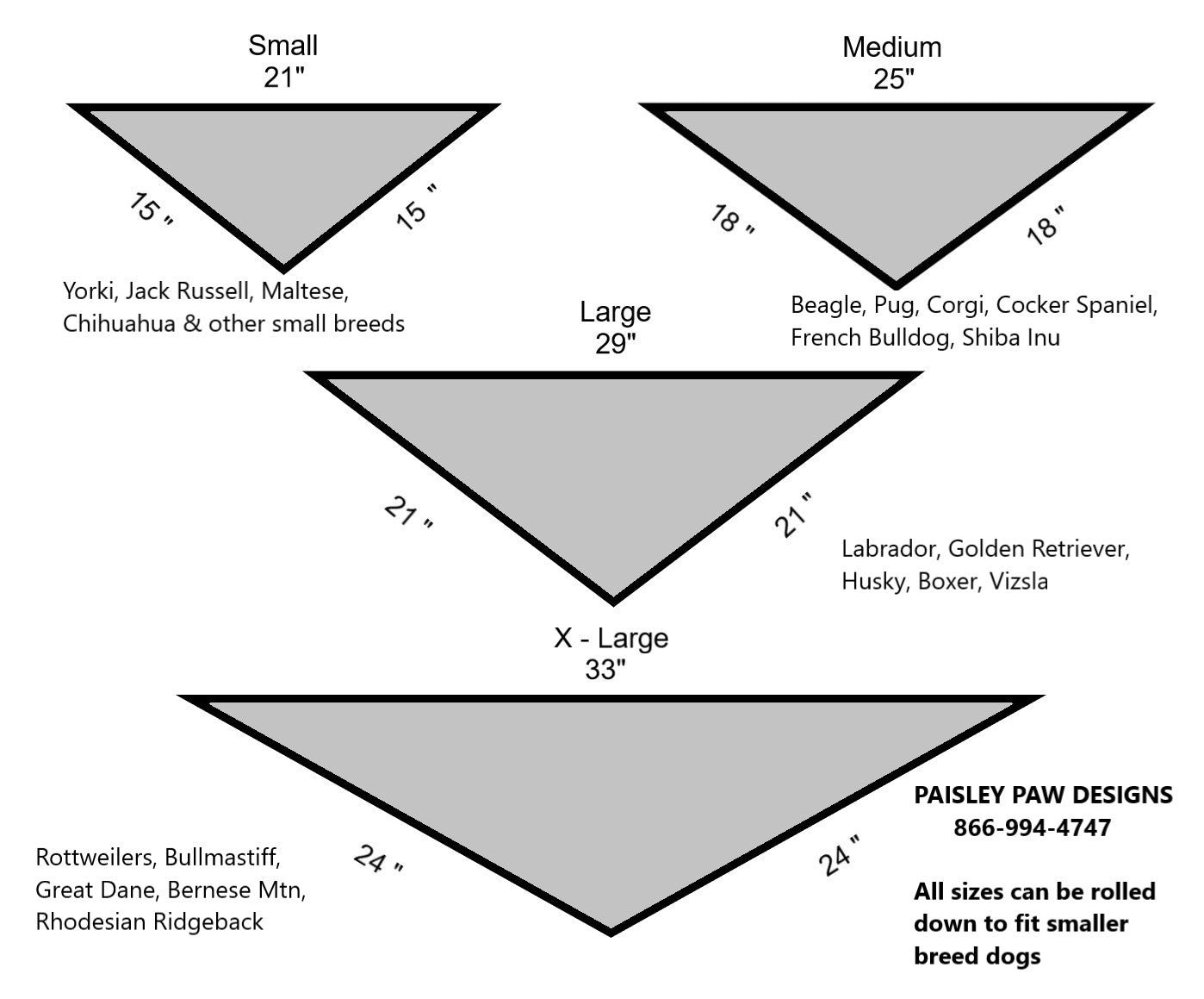 How to Use: For large dogs just tie around neck, smaller dogs roll down the top edge to make smaller and tie around neck, leaving a few inches for comfort. Wear bandana in front of chest or to the side or laying on dogs back – you choose the look!