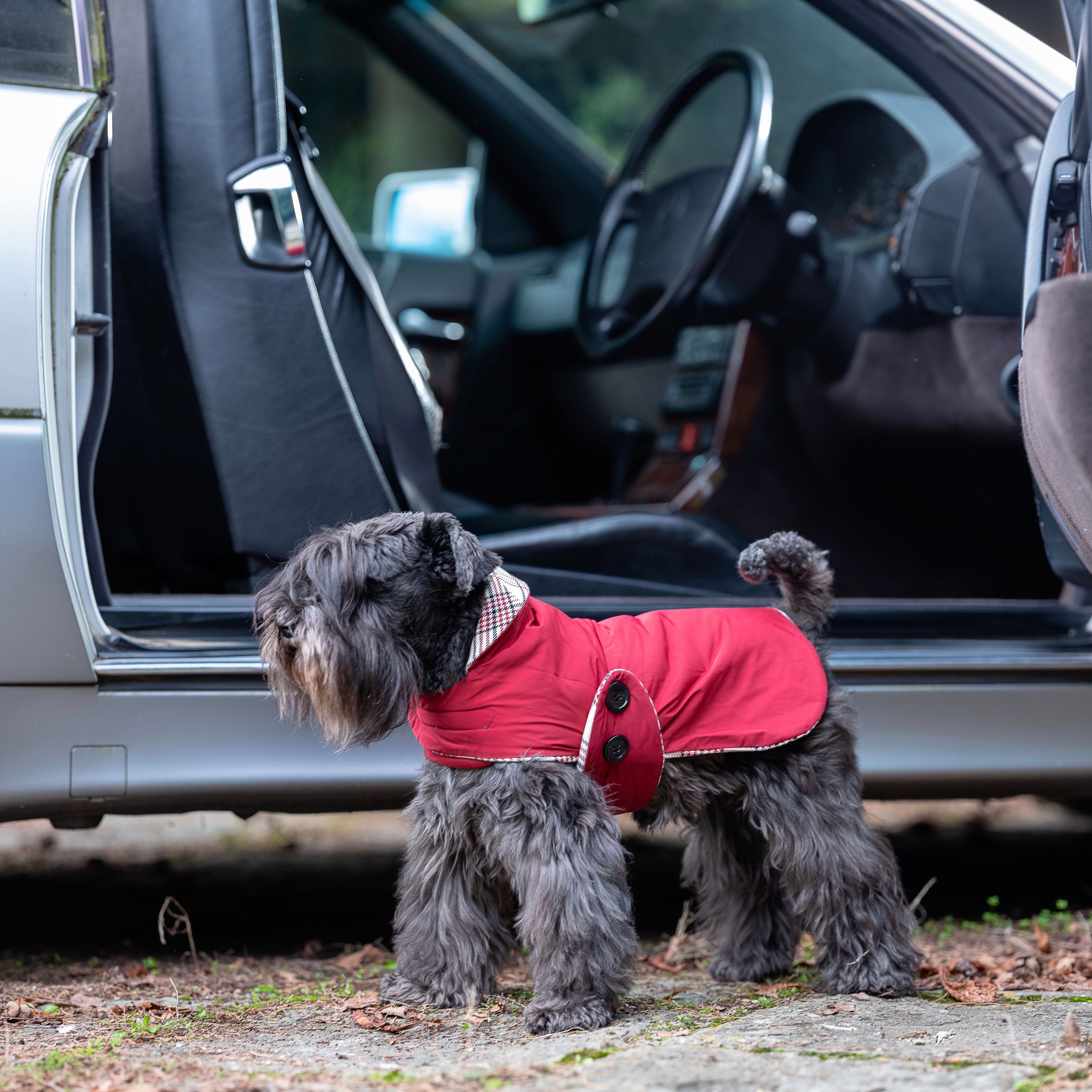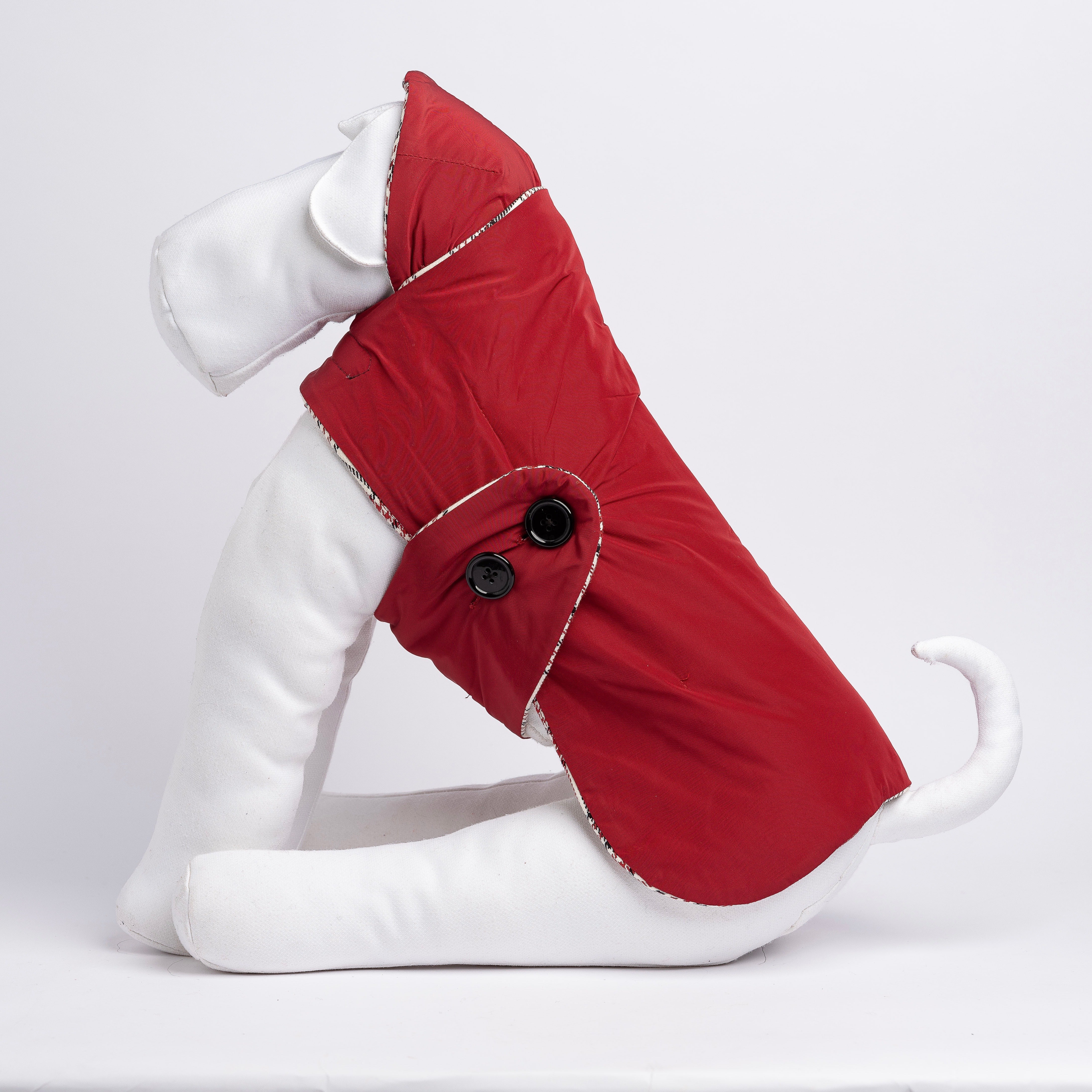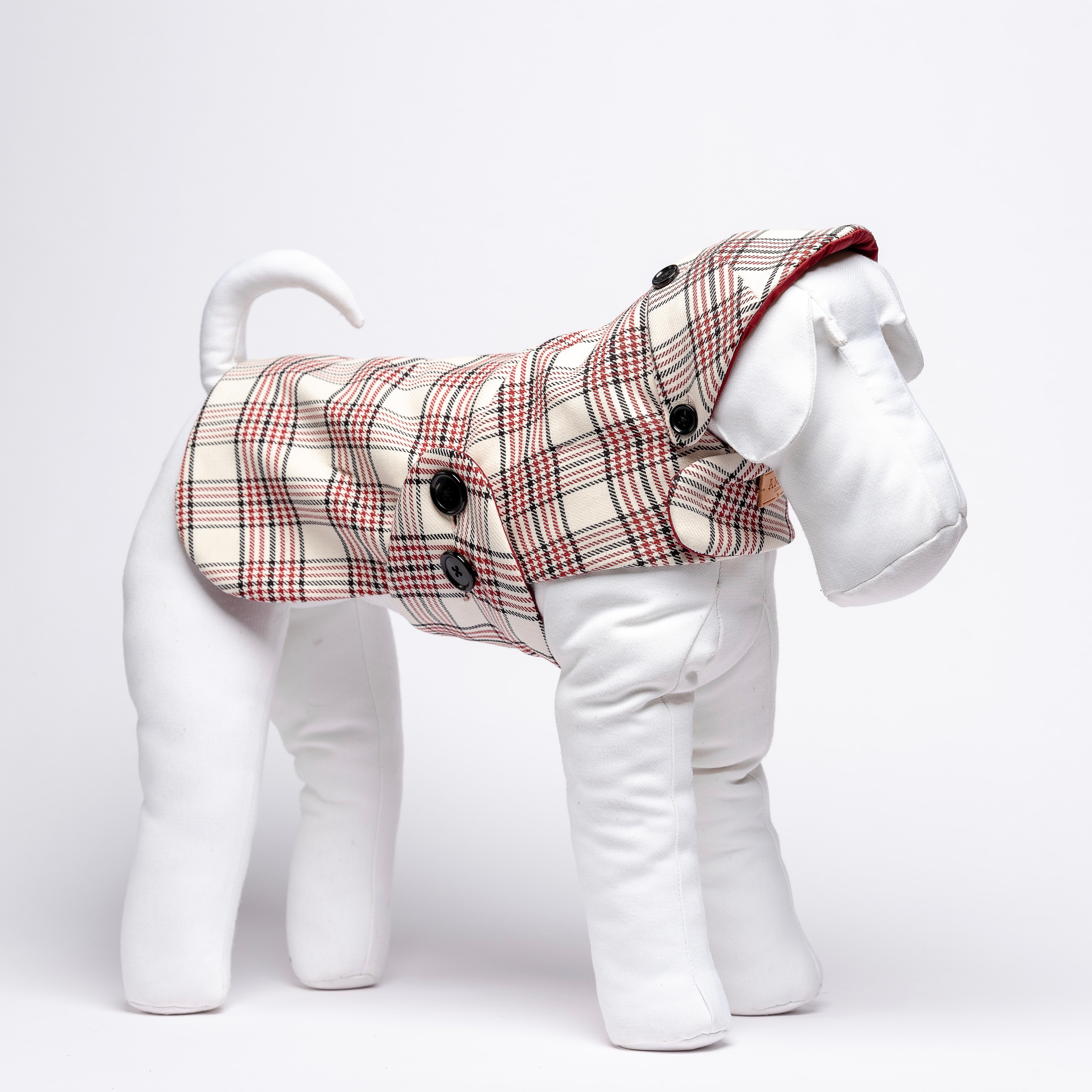 Edward VIII raises the idea of dog coats and raincoats to luxury craftsmanship products, simply combining the refined Prince of Wales cotton on one side with an intense ruby red waterproof fabric on the other in a perfect union. The internal padding is made of ultra-light professional technical fiber for exceptional thermal insulation and perfect breathability. It has never been easier to let your four-legged friend wear a garment: the convenient and fast closing system uses two maxi buttons. The function of the bellyband is to defend the abdomen from cold and splashes of rain. For added protection we have designed a removable hood with coordinated buttons to those for closure.