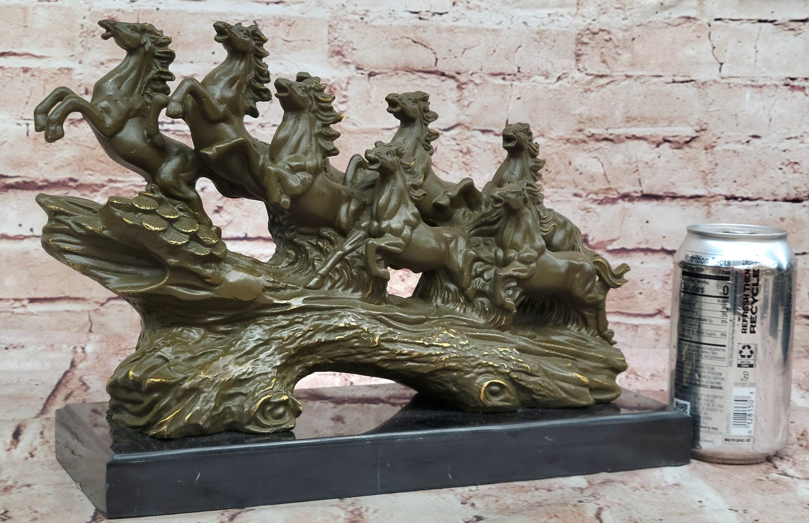 Expertly handmade using the lost wax method, this sculpture is cast in 100% genuine bronze with a rich brown patina that enhances the muscular details and dynamic movement of each horse. The piece is elegantly mounted on a polished black marble base, giving it a timeless and stately presence.