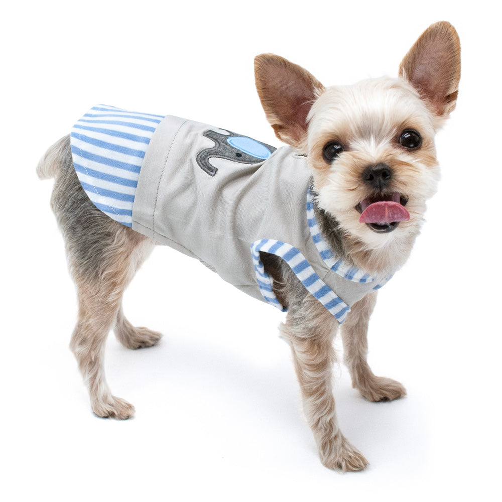 This pet tank combines classic style with adorable charm. The vertical stripes create a sleek and sophisticated look, while the contrasting gray top features an endearing big-eared elephant patch decal, adding a touch of cuteness to your pets outfit. But its not all about looks – weve added a convenient leash hole, making outdoor walks a breeze.