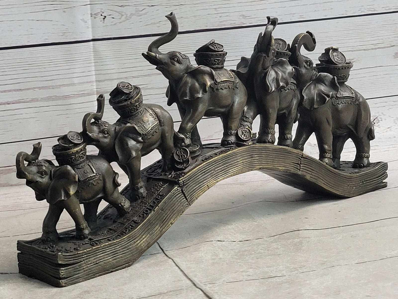 This magnificent bronze sculpture captures the awe-inspiring sight of a clan of elephants congregating around a serene watering hole in the vast plains of Africa, marking the culmination of an epic migration. With their trunks raised in triumphant trumpeting, these majestic creatures emanate an aura of strength and power that has made them a revered symbol throughout history. In various Eastern cultures, elephants hold deep spiritual significance, representing patience, wisdom, energy, strength, wealth, and power. Notably, the elephants in this sculpture are depicted crossing a bridge ingeniously crafted from stacks of hundred dollar bills, symbolizing good fortune and prosperity for your home.