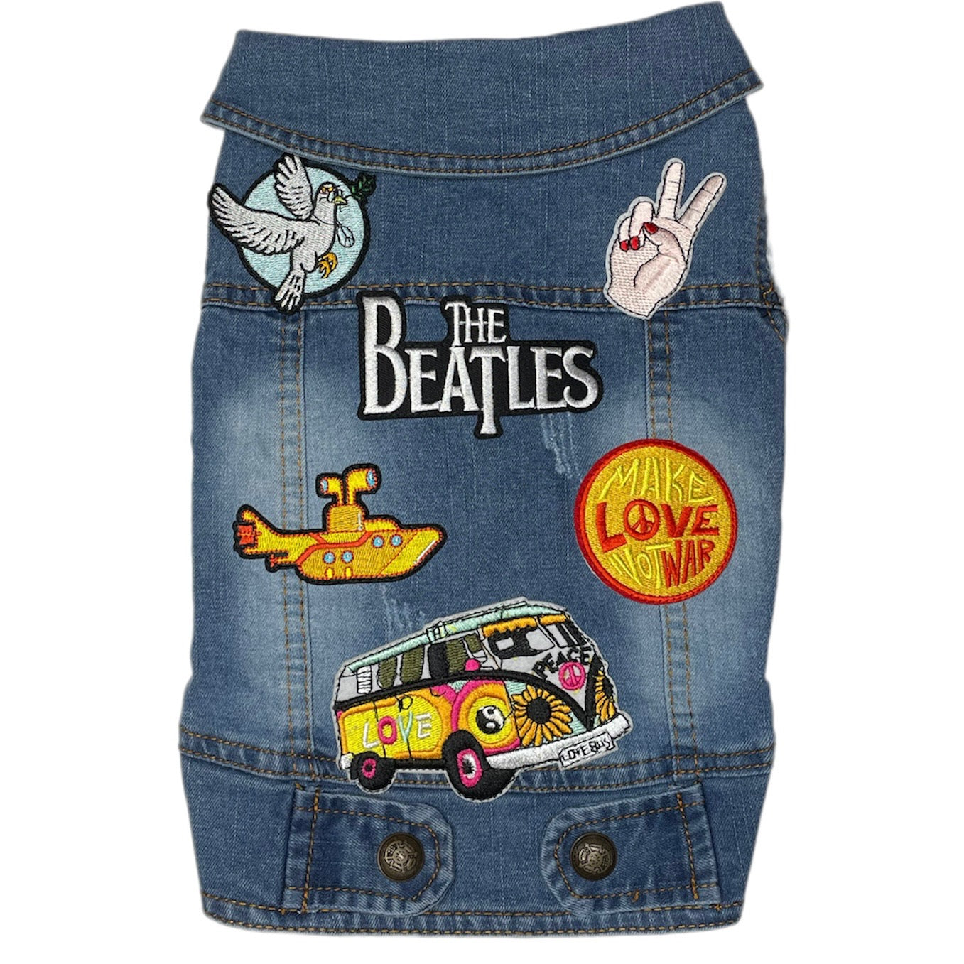 It's time to rock n roll with our "Fab Four" denim vest. The main patch is "Beatles" and the secondary patches may vary. Secure with a reliable plastic snap closures and add a repurposed denim D-ring to hook on a leash (Optional Add-on).