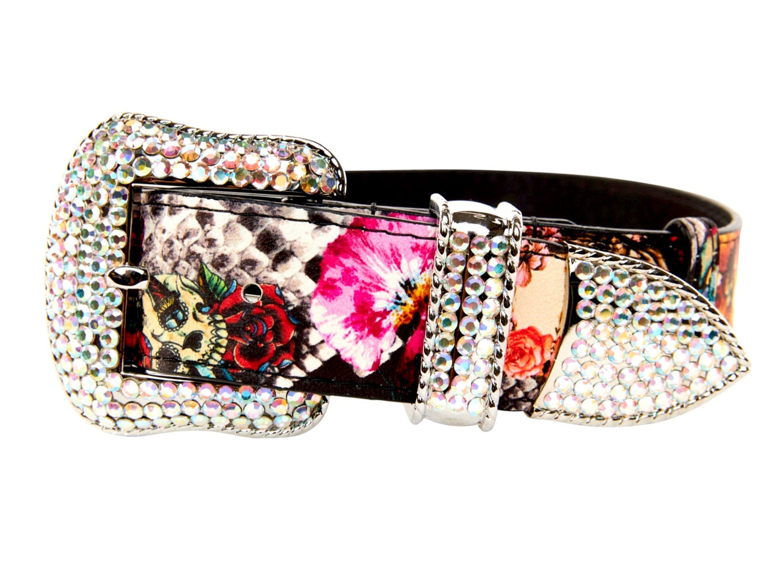Introducing the Floral, Scull, Snake Print Italian Leather Collar With Swarovski Crystal Hardware – a statement of sophisticated fashion and luxury. Crafted with premium materials and designed to turn heads, this piece adds a touch of glamour to any wardrobe. Ideal for those who demand both style and exclusivity in every detail.