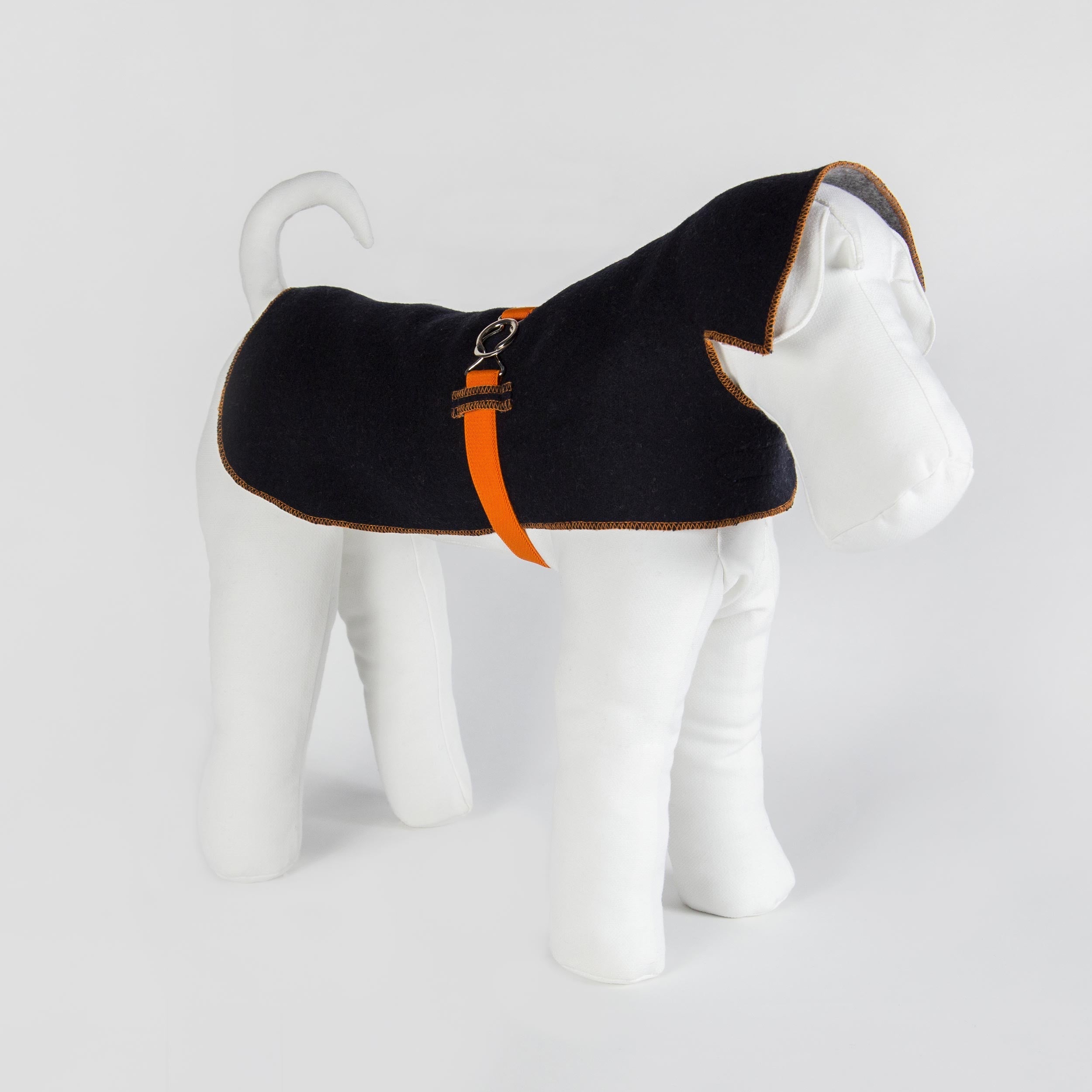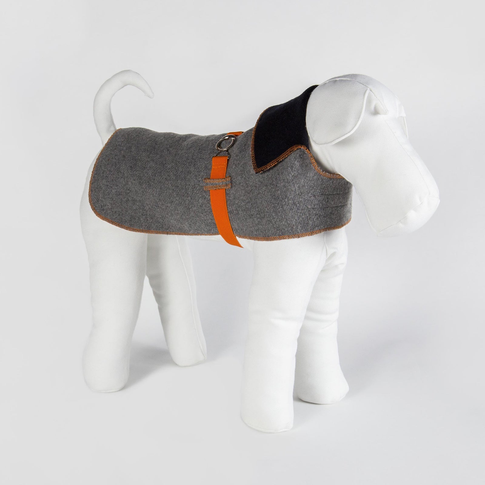 Reversible dog jacket made of paired sharp cut wool fabric: navy blue on one side and gray on the other. Cheerful orange top-stitches in contrast match with the elastic belt with a reef knot buckle. A real handy and comfortable article of dog clothing for all seasons! Thanks to its reversibility and to its handy and quick fastening system, you can choose between the blue or the gray side. Two articles of clothing in one!