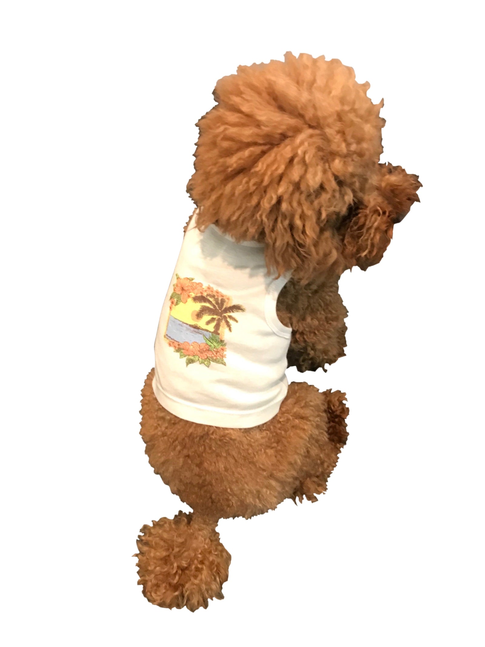 Your dog will look an island-chic with the Hawaiian Sunset Tank Top (Scenic). Its comfortable white cotton and screenprinted front will have him/her feeling fresh and confident all day during summer.