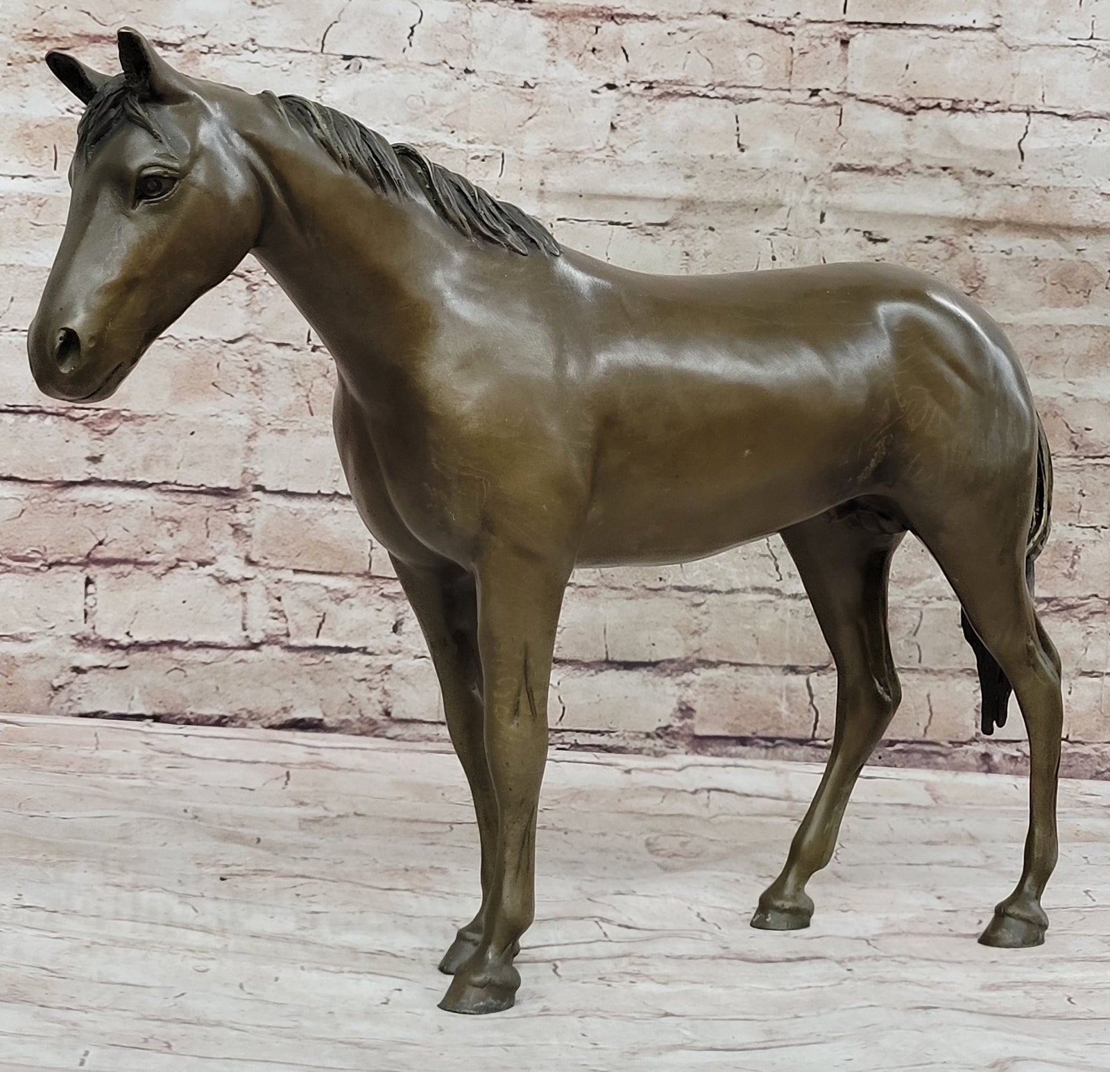 This "Hand Made Stallion Horse" sculpture, a symbol of strength, nobility, and natural beauty, is a striking addition to any art collection or decor. With a harmonious blend of tradition and innovation, it reflects the artist's dedication to preserving the essence of the stallion for generations to come. From the lost wax method to the expertly applied brown patina, every detail exemplifies the artist's commitment to excellence, inviting viewers to connect with the spirit of the stallion and the artistry of P.J Mene.