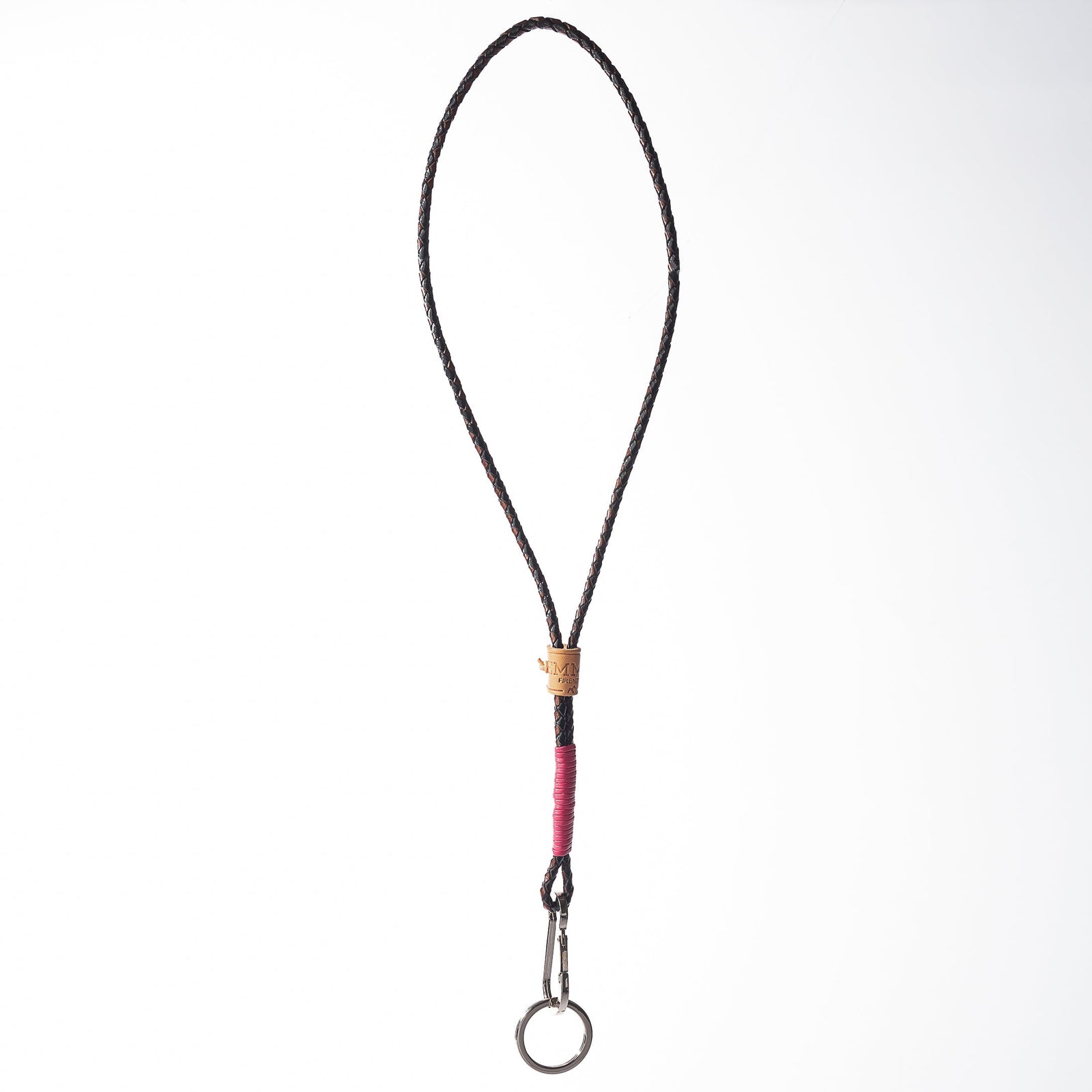 The neck key ring, made with a coaxial weave in dark brown and black leather, with fuchsia-colored ligatures, is equipped with the EMMA Firenze label, this time conceived as a slider for adjustment. By scrolling, it allows you to enlarge or shrink the key ring around the neck.