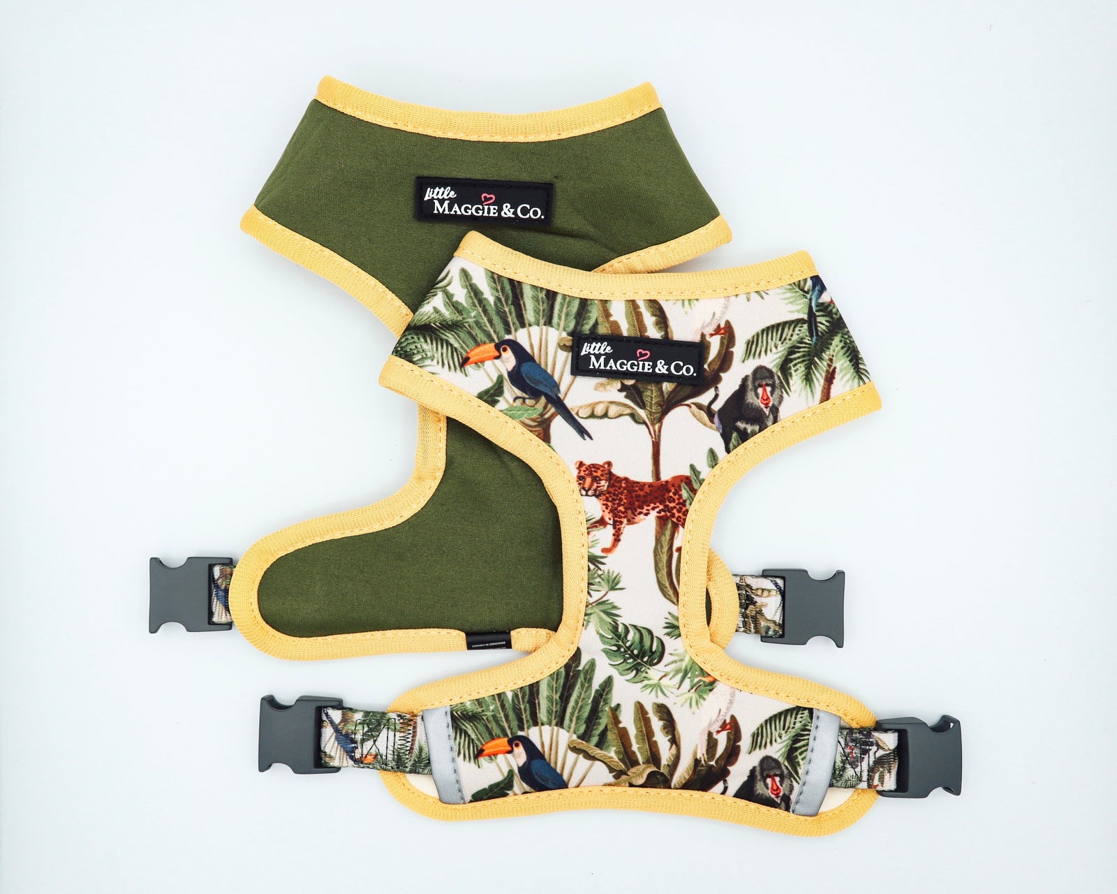 Fun and intriguing this print brings you into the wild, into the lush foliage of the jungle. “Into the Wild” is an animal lover’s delight with an infusion of jungle animals. The reverse is a deep olive, a color that compliments everyone and a powerful contrast from yellow trim.