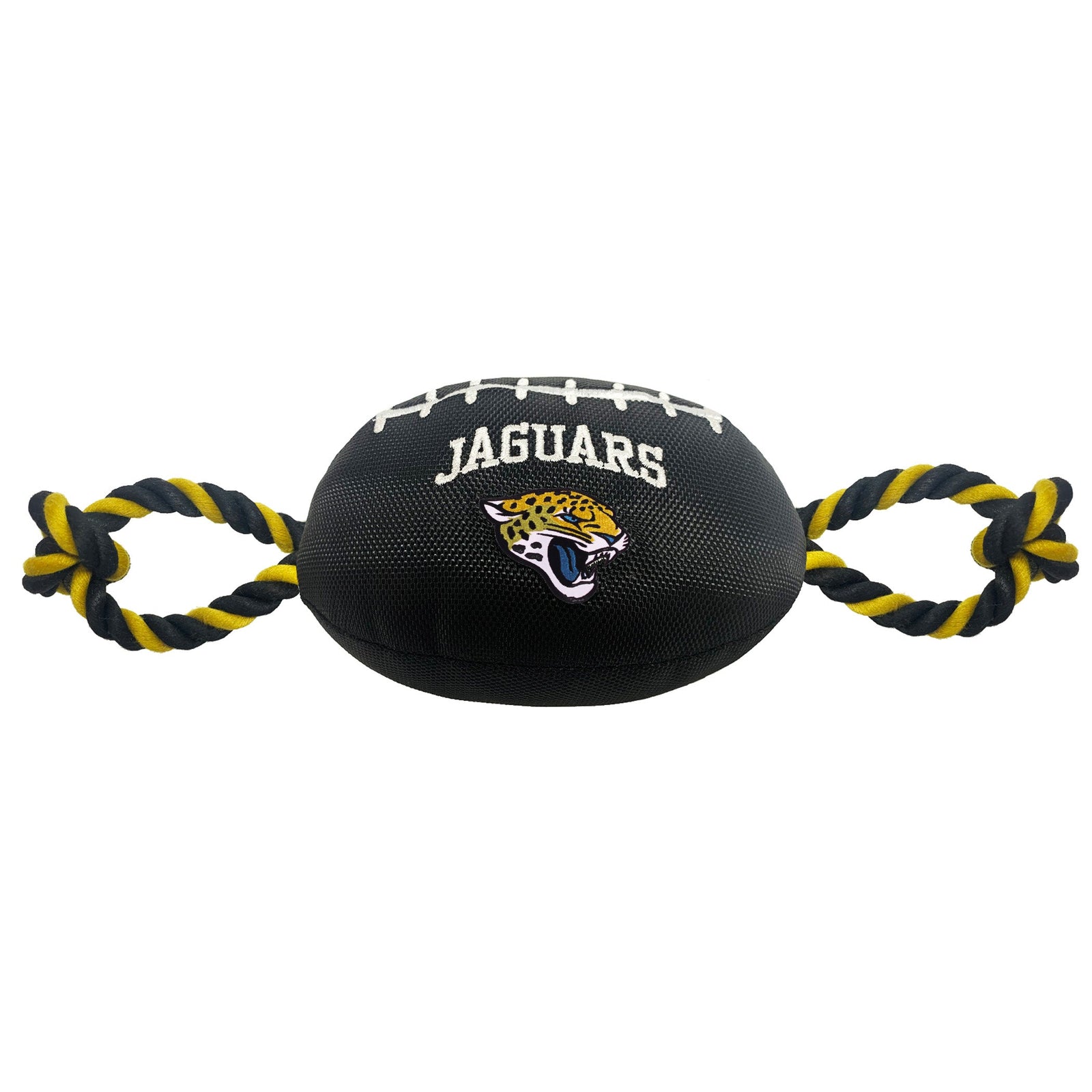 Nylon football toy has an embroidered NFL team logo on the front, and the team logo on the back. The squeaker and contrast tug rope make it great fun for you and your pet!