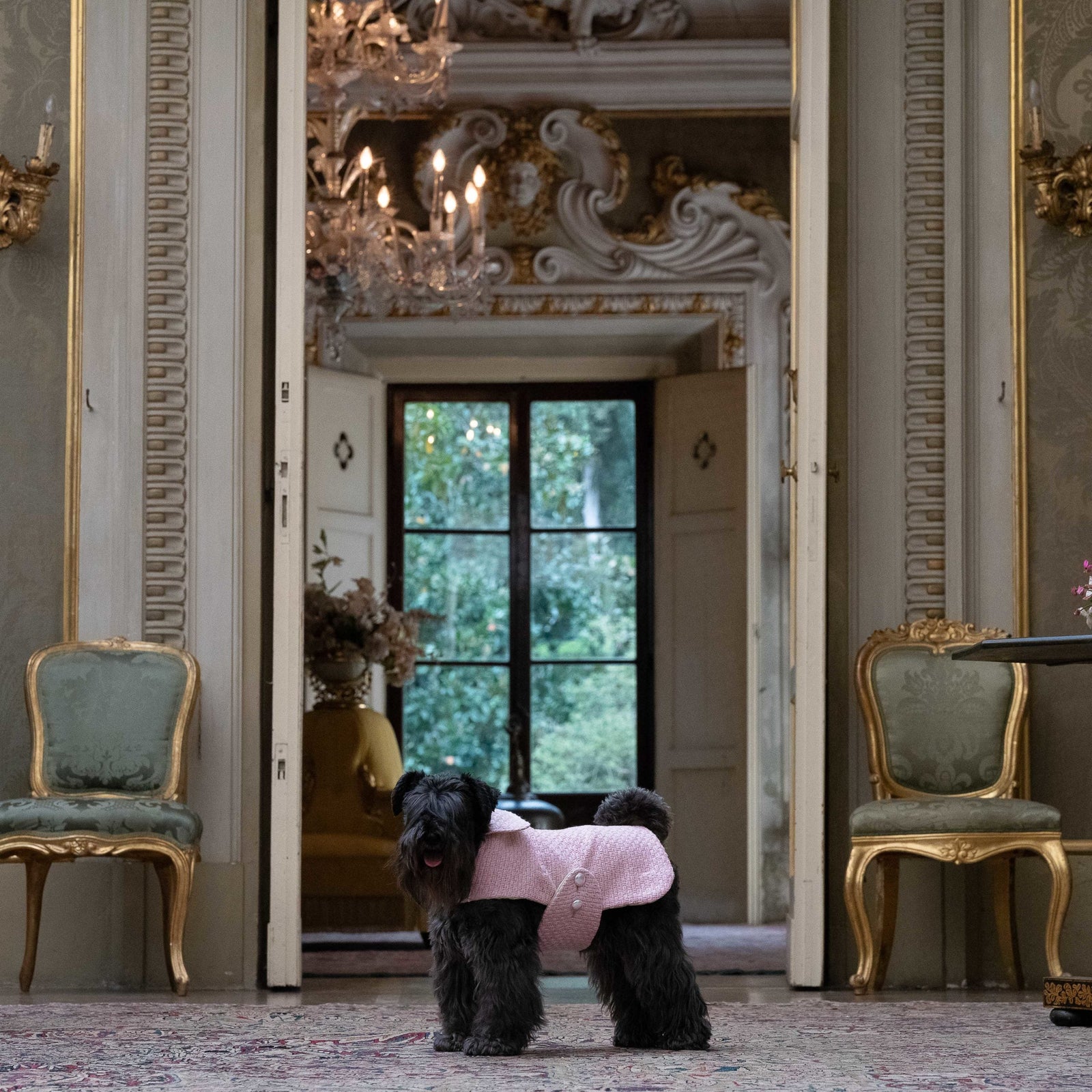Jacqueline, a double-face coat for dogs, is made to measure with two materials and contrasting colors: on one side a fabric with a Chanel weave in Tuscan pink dry wool; on the other, a lime green waterproof nylon fabric. The comfortable bellyband, which protects the abdomen from the cold and splashes of rain, allows the closure on the side with pearl jewel buttons: it has never been easier to let your four-legged friend wear a garment. The internal padding is made of ultra-light professional technical fiber for exceptional thermal insulation and perfect breathability.