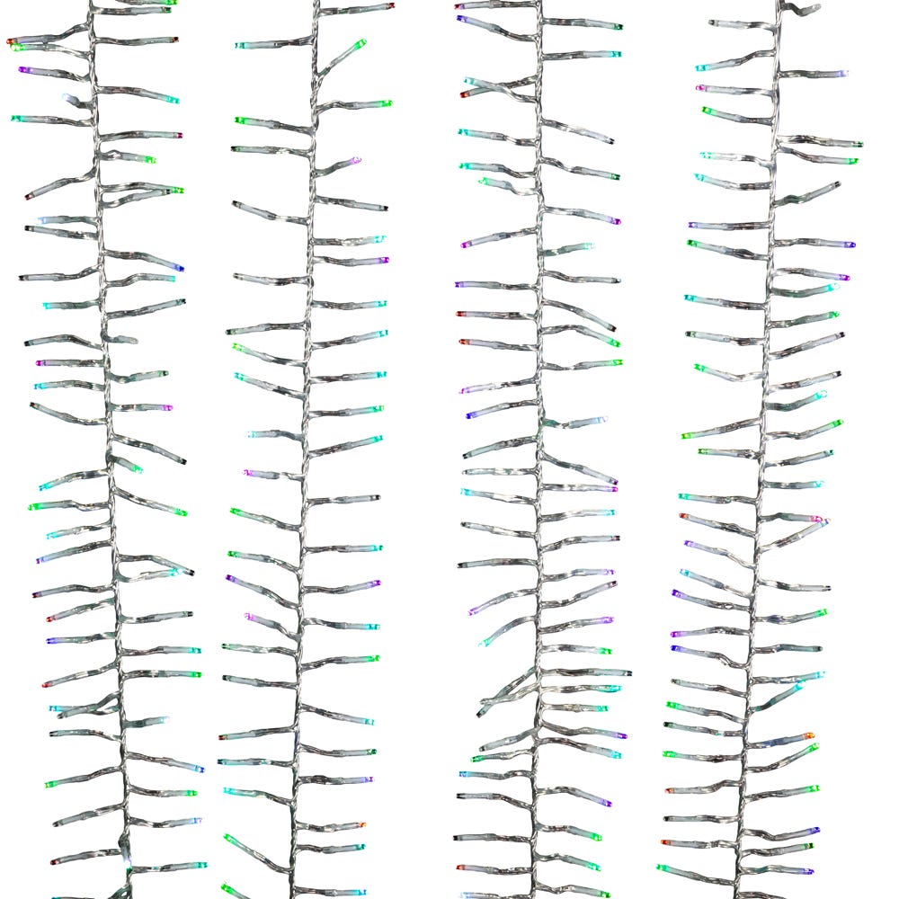Kurt Adlers 480-Light 15.7-Foot RGB LED Connectable Cluster Garland is a festive and colorful lighting decoration that is perfect for adding some cheer and brightness to your holiday decor. It features 480 LED lights that are arranged in clusters along a 15.7-foot long garland. The lights are capable of displaying a range of different colors, including red, green, blue, and more, allowing you to customize the look of your decor to suit your taste. The garland is connectable, meaning you can easily attach up to 3 garlands together to create a longer, more dramatic display. This cluster garland includes a 16.4 green lead wire and is suitable for indoor or outdoor use, making it a versatile and convenient choice for adding some extra holiday cheer to your home or event.