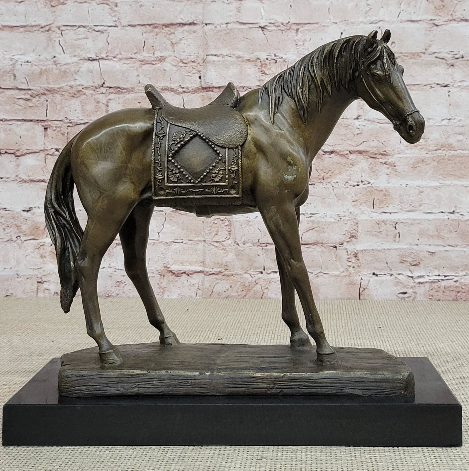 Horses are known and loved for their agility, graceful movement, strong bodies and sleek coat. They ignite a feeling of freedom and uncharted paths. This sculpture is perfect for any horse lover and collector. This horse has broken free of his reins, saddle and the restricting ranch he lived on. He trots freely in the open land. His eyes widened at the sight of soaring birds. 100% bronze and handmade, this brown patina sculpture was cast using the "Lost Wax Method" and mounted on a black marble base. It is signed by the artist Fisher.