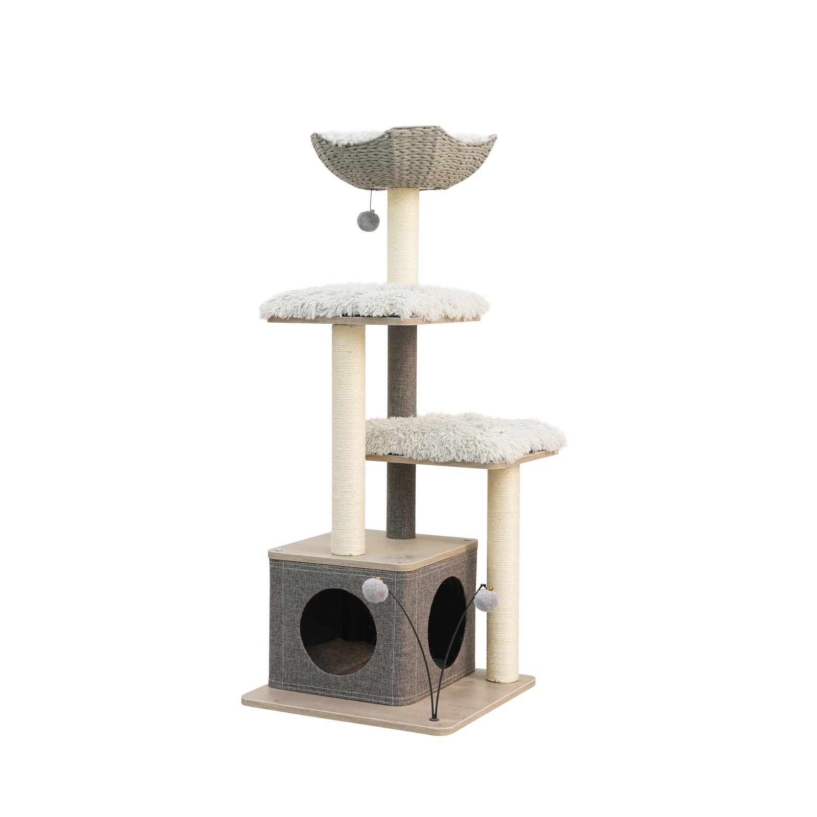 Our multifunctional Leon 5-level cat tree combines a minimalistic and modern design to fit any home décor. This cat tree includes a handwoven eco-friendly basket with a soft shag bed that is perfect for your cat to nap and rest, as well as make their famous biscuits (knead)! The climb to the top is easy with the comfortable soft shag fur levels. Leon cat tree includes 100% natural sisal rope scratching posts that help promote healthy scratching and nail care. Keep your cat active and playful with our added teaser toys! After a long day of being cute, your cat may hide and relax inside the linen-lined condo, equipped with shag fur for a cozy finish.