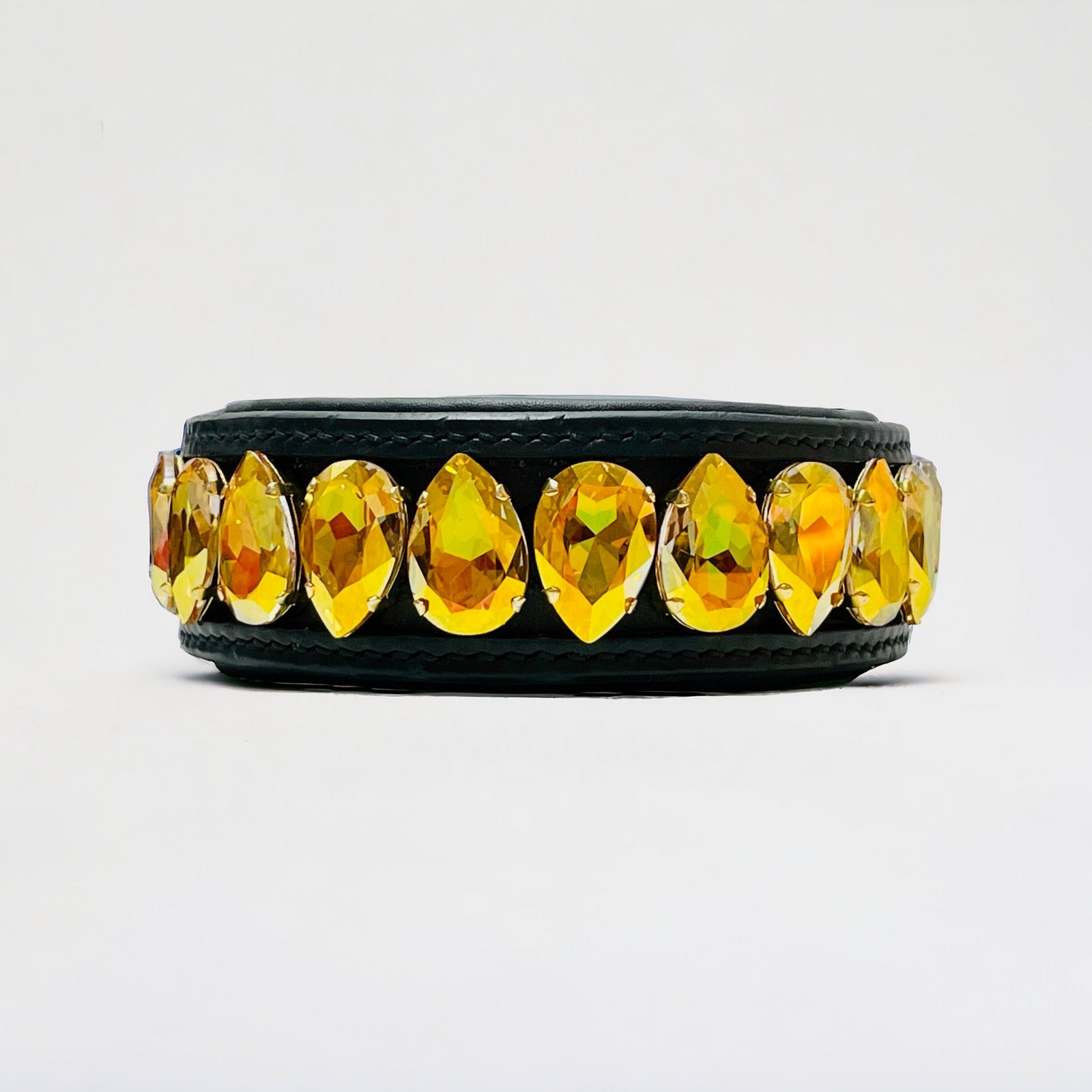 Elevate your dog's style with the Liz Big Dog Collar Metallic Sunshine! Handmade in Sweden with high-quality leather, this custom collar is soft and comfortable yet robust. Limited edition Metallic Sunshine Fancy Stones adorn the 52mm width, accented with high-end crystals. Give your furry friend the luxury they deserve.