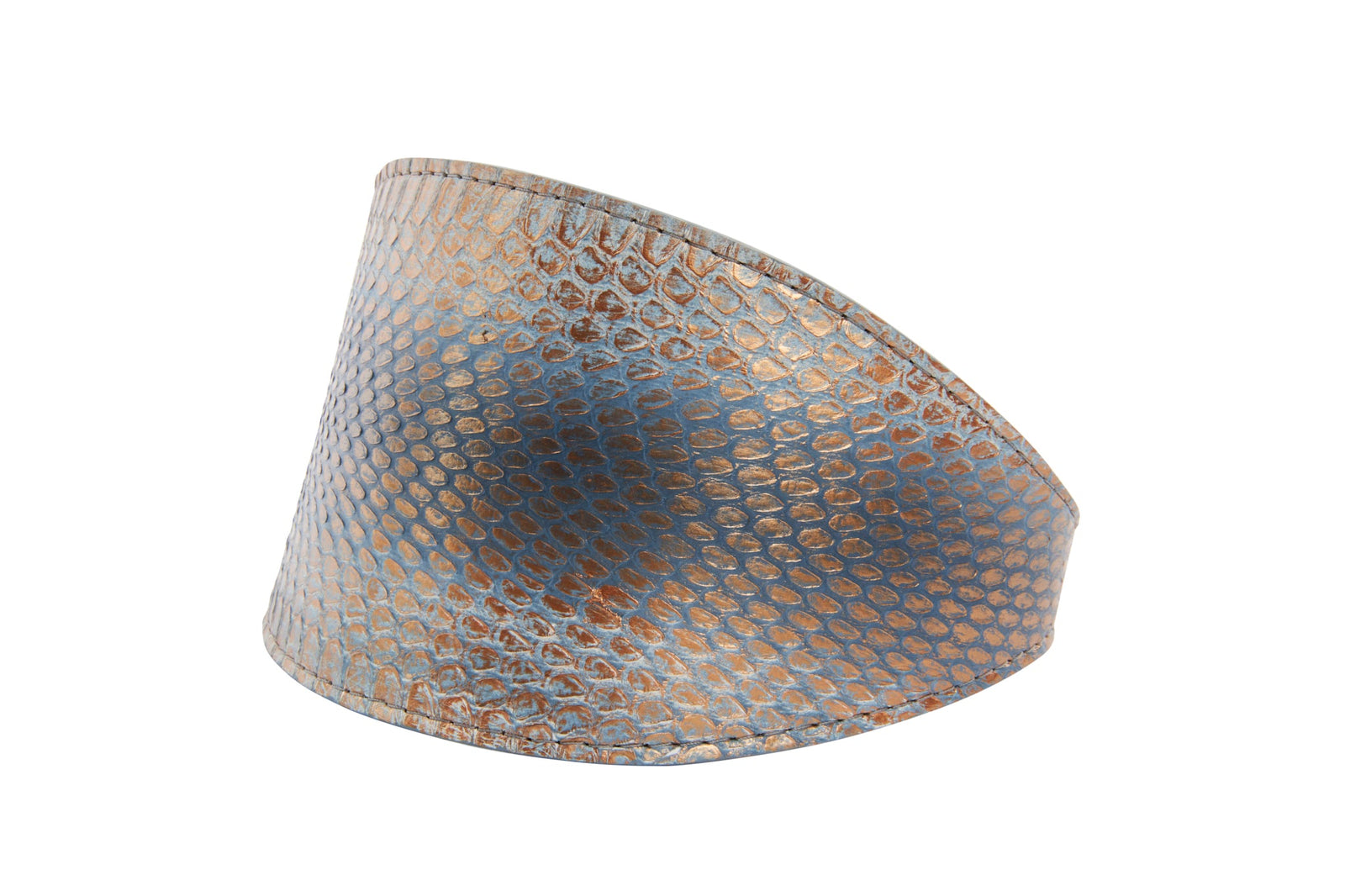 Introducing the Luxury Pet Fashion Baby Blue/Blue/Bronze 3” Wide Snake Collar – a statement of sophisticated fashion and luxury. Crafted with premium materials and designed to turn heads, this piece adds a touch of glamour to any wardrobe. Ideal for those who demand both style and exclusivity in every detail.